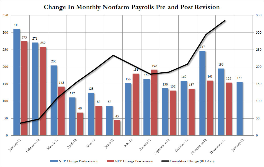 今日數(shù)據(jù)的最大意外之處在于,11月和12月數(shù)值都出現(xiàn)大幅上修,總計額外增加了12.7萬個就業(yè)崗位,表明美國勞動市場在2012年底出現(xiàn)改善。 這和周三發(fā)布的GDP數(shù)據(jù)構成鮮明對比。周三數(shù)據(jù)顯示,美國第四季度GDP初值萎縮了0.1%,但這可能只是受一次性因素影響。 失業(yè)率從7.8%上升至7.9%,但FT說,很難對此作出解讀,因BLS對人口估計數(shù)進行了年度修正。 美國諮商會(Conference Board)宏觀經(jīng)濟分析主管Kathy Bostjancic說:“好消息是,1月的就業(yè)增長,以及此前兩月的大幅上修,將意味著更多消費支出能力。壞消息是,失業(yè)率依舊居高不下。” Capital Economics首席美國經(jīng)濟學家Paul Ashworth說:“在消極的GDP報告過后,1月就業(yè)報告應該能夠幫助緩解對美國經(jīng)濟走向衰退的擔憂。” 2012年全年,修正后的新增就業(yè)人數(shù)較最初發(fā)布數(shù)據(jù)累計高出33.5萬人。下圖顯示了修正前后的數(shù)值對比: