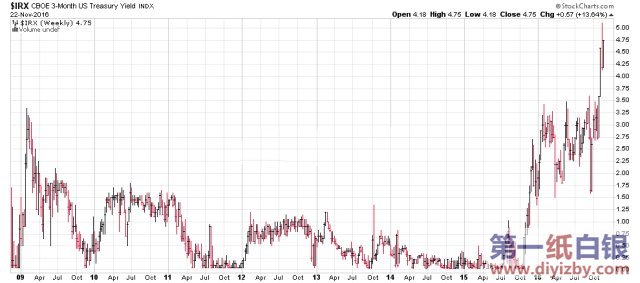 眾所周知,白銀價格在去年12月開始一輪上漲行情,從最低點13.5美元每盎司上漲至今年7月上旬的21.1美元每盎司。在短短6個月的時間里白銀上漲幅度超過40%,不可謂不驚人。但是接下來,在7月上旬之后,白銀的牛市就漸漸退去。至此之后白銀的價格逐步下跌。目前走勢還未到底部,主要有以下幾個方面的原因。 3月期美債利率飆升 ![]() 美元指數的上漲 ![]() 美元繼續上漲,則市場避險情緒將繼續降低,資金不僅僅會從貴金屬市場持續流出,而且隨著美元上漲,則以美元標價的黃金和白銀也會持續走弱。 另外,自2011年以來美元指數和美國三月期國債利率基本保持同步。此外,國債收益率在11月繼續上漲,這暗示美元指數將進一步走強。 ![]()