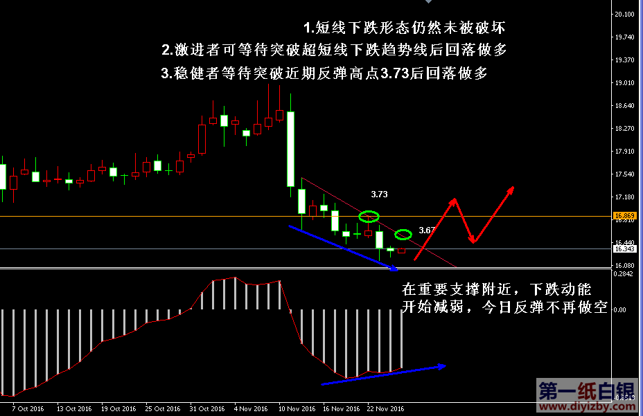 目前紙白銀價格是3.620/克。昨日紙白銀維持震蕩走勢,銀價雖暫時守穩3.6附近的支撐,但目前尚未出現一輪有效的反彈,說明多頭力量仍然薄弱,今日投資者仍需繼續關注行情的反彈力度,若其能向上突破3.73,則暗示近期買盤動能有所增強,后市銀價圍繞3.6支撐企穩止跌的概率將增大。如下圖所示為紙白銀日線走勢圖,目前行情的短線下跌形態仍然保持良好,且超短線行情正在圖中紅線所示的下跌趨勢線下方運行,多頭尚未出現明顯的復蘇跡象。不過,日線動能指標MACD出現收量跡象,且形態上存在底背離風險,或暗示短線空頭動能有所減弱,加之銀價目前正在中線支撐3.6附近徘徊,建議投資者日內反彈不再做空。若近期行情能出現一輪較大反彈,則銀價日線級別底背離形態或將成型,屆時行情有望圍繞3.6(16.25美元)附近開始真正構筑底部。今日我們針對投資者給出2種建議:1.激進者至少等待銀價反彈突破下圖紅線所示的趨勢線后開始做多,今日趨勢線壓制位于3.67附近(16.55美元),激進者可等待銀價突破3.67后直接跟進多單,回落輕倉補倉,嚴格止損3.58下方;2.穩健者必須等待銀價突破圖中黃線處所示的近期反彈高點,若走勢突破此處,則說明較前期相比,銀價獲得了更多的買盤力量支持,屆時將確認近期空頭力量不再增強的情況下,走勢將圍繞3.6附近構筑底部的事實。綜合分析,經歷了本周三的下跌行情后,日線銀價走勢并未表現出空頭繼續增強,反而出現了下跌動能減弱的跡象,考慮到中線支撐3.6附近本身存在一定買盤動能支持,投資者在此處未被破位之前,暫不可盲目做空。日內行情一旦出現反彈,則又有可能確認多頭復蘇力量,因此反彈后也不可再高拋做空。投資者近期主要圍繞銀價反彈力度增加做多倉位,其反彈幅度越大,則多頭越強,所增加的多單倉位可越大;反之,若銀價小幅反彈后便進入橫盤整理,則后市需謹防走勢持續震蕩后的“盤久必跌”風險發生,因此,在其依次突破3.67、3.73、3.8之前,投資者可根據突破情況少量增加倉位即可。(注: 由于紙白銀價格是國際銀價換算而來,而換算過程中涉及到人民幣對美元匯率的變化,即使在國際銀價不變化的情況下,如果人民幣貶值或升值,也會導致紙白銀價格出現變動。因此,我們的分析只采用最新的國際銀價對應的人民幣白銀價格,如與過去分析價格有出入, 投資者應知曉其原因。)