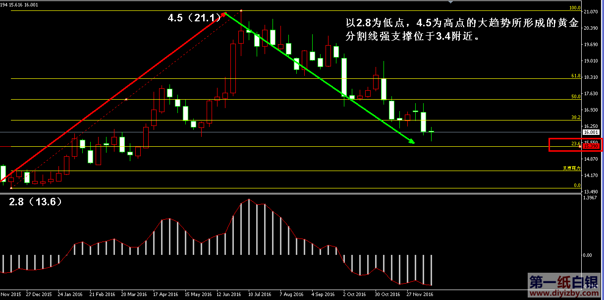 目前紙白銀價格是3.568克。昨日紙白銀大幅下跌后觸底反彈,在跌破3.51(15.8)后,銀價下方目前僅剩一道強支撐位于3.4(15.4)附近,昨日行情未能觸及該點位,因此推測后市銀價無論是先震蕩還是先反彈,在其調整完畢后,都將再度考驗3.4(15.4)的可能性較大,而后行情若能圍繞該點位企穩,并向上突破3.8(17.2)強弱分水嶺,屆時我們才考慮行情止跌反轉的可能性,否則以目前多頭力度,建議投資者始終以高拋為主,低吸為輔。如下圖所示為白銀周線走勢圖,目前短線下跌行情延續較為明顯,銀價若要企穩,則必須觸及更大周期的支撐位,且形成強力有效的反彈突破關鍵點位。圖中紅色箭頭所示為銀價從2.8(13.6)歷史低點開始至4.5(21.1)年度高點的一輪大趨勢,而綠色箭頭為2016年7月至今的下跌趨勢。可見只有在長周期形態中,銀價才維持主趨勢上漲和次級趨勢回調的格局,其支撐位處于2.8~4.5該區間的黃金分割線23.6%的位置,此處便是我們所說的3.4(15.4)附近。如果我們將圖中紅色箭頭和綠色箭頭的走勢作為一個整體,那么目前走勢僅僅完成了一次大周期的“進三退二”步伐,未來若能在3.4(15.4)附近完成止跌反轉,則行情必然有望再度開啟新一輪“進三”行情,這也是我們主要期待2017年上半年的走勢形態。基于此,近期銀價在未觸及3.4(15.4)之前,投資者見到行情反彈便可嘗試高拋做空,目標看至3.4附近;若見盤中銀價回落至3.4附近,投資者可配合超短線反彈信號出現后(1小時收中陽線),在3.4上方做多,嚴格止損3.4下。綜合分析,近期我們一直強調,銀價在未出現止跌企穩信號之前,行情始終存在再度回踩的可能性。果不其然,昨日銀價回踩跌破3.51(15.8)后繼續向下打開空間至3.4(15.4)。與前期形態一樣,近期行情在下跌后的第一次反彈都將無法直接扭轉趨勢,未來銀價再度回落的可能性極大。只有確認多次守穩低位支撐,并形成反彈突破3.8強弱分水嶺后,銀價才能真正完成初步的止跌企穩信號,屆時多頭方可開始增加倉位進場,在此之前的任何做多均為激進者的試盤操作,需嚴格止損。(注: 由于紙白銀價格是國際銀價換算而來,而換算過程中涉及到人民幣對美元匯率的變化,即使在國際銀價不變化的情況下,如果人民幣貶值或升值,也會導致紙白銀價格出現變動。因此,我們的分析只采用最新的國際銀價對應的人民幣白銀價格,如與過去分析價格有出入, 投資者應知曉其原因。)
