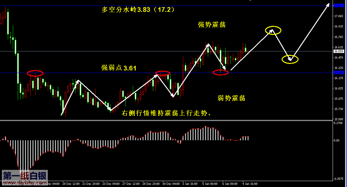 目前紙白銀價格是3.684克。昨日白銀價格小幅收陽,行情正通過持續高位震蕩的方式修復可能帶來的指標偏離,另外通過高位整理亦可完成新一輪多頭的蓄力,這對銀價未來上行沖擊強阻力帶3.73~3.83(16.8~17.2)將起到積極的作用。目前行情距離該阻力仍有小幅空間,且當前銀價震蕩后指標偏離情況有所減弱,后市走勢將有較大概率繼續沖擊阻力帶,投資者注意觀察銀價在該區間的表現,尤其是若見沖高回落,則密切關注其回落幅度,若能經歷一輪空頭力量釋放后企穩,則第二次沖擊該區間突破的可能性將增大。如下圖所示為白銀4小時周期走勢圖,從超短線銀價的走勢形態我們可以捕捉到諸多信號和特征:正如圖中紅色圈所示,最早時候我們曾以3.61(16.25)作為銀價的強弱點,當行情突破該點位后,走勢進入強勢震蕩區域3.61~3.83(16.25~17.2)之間,而上周五非農日銀價最低便剛好回踩了強弱點后形成反彈(圖中紅色圈),目前走勢正有再度向上拉升的意圖。如果以12月最低點至目前價格繪制波浪形態,我們還可以發現當前銀價短線正處于震蕩上行步伐之中(白色箭頭),雖然近期行情即將觸及強阻力帶3.73~3.83(16.8~17.2),但該震蕩上行形態仍然有望保持良好。正如圖中黃色圈所示的假設形態,銀價若沖高3.73(16.8)附近出現沖高回落,但其回落后能夠守穩3.61(16.25)的強弱點,則整體走勢依舊符合短線震蕩上行的步伐,則后市銀價再度拉升后將逐漸突破3.73~3.83(16.8~17.2)的可能性亦較高;反之,若銀價在沖高3.73(16.8)附近后出現了較大的回落行情,跌破3.61(16.25)后將令短線走勢轉入橫盤整理,這可能延長走勢低位震蕩蓄力的時間。綜合分析,銀價昨日的高位震蕩幫助行情有機會延續短線震蕩上行走勢,但上方阻力較近,投資者暫不可盲目追多,建議持有少量多單保持觀望,等待銀價觸及區間3.73~3.83(16.8~17.2)附近后減倉或離場,若見到明顯的沖高回落信號,則可擇機高拋,但若見回落中有企穩反彈跡象,則立即離場空單,接下來需等待行情對于多空分水嶺3.83(17.2)的突破。銀價一旦突破3.83(17.2),則2017年上半年走勢必然將重演2016上半年的上漲行情,中線上漲趨勢將延續。(注: 由于紙白銀價格是國際銀價換算而來,而換算過程中涉及到人民幣對美元匯率的變化,即使在國際銀價不變化的情況下,如果人民幣貶值或升值,也會導致紙白銀價格出現變動。因此,我們的分析只采用最新的國際銀價對應的人民幣白銀價格,如與過去分析價格有出入, 投資者應知曉其原因。)