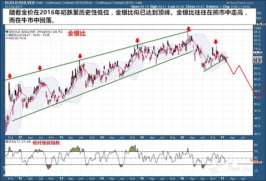 黃金白銀從年初開始的連續上漲,吸引了不少投資者,主要因特朗普上任后的不確定性和歐洲政局風險刺激主導。不過避險情緒下,銀價漲幅卻超過了金價,也被投資者解釋為當前投機盤更加青睞于價格較低的白銀,究其原因是“金銀比”此前過高,套利投資者更加愿意買入白銀。 原則上,在貴金屬熊市中,白銀受到的打擊會更重;反過來,白銀在牛市中的表現會更好。因此,金銀比往往在熊市中走高,而在牛市中回落。當前金銀比回落是否暗示貴金屬已經處于牛市? 貴金屬研究網站Goldseek專欄作者勞卡斯(Bob Loukas)指出,從2012年至2016年初,黃金與白銀均遭到大幅拋售,金銀比不斷走高,反映了貴金屬處于熊市。在此期間,金銀比每一個小高峰都與重大周期的價格低位相對應,亦即隨著黃金價格觸及年內低位,白銀跌得更慘。 不過,從圖中看,這一趨勢已經有所逆轉——金銀比已經開始從高位回落。而且從白銀最新的表現來看,其在五年來首次超過了黃金。但凡這種情況的出現,基本上都預示著整個貴金屬市場會繼續走高。勞卡斯預計,金銀比將繼續走低,并由此開啟一輪下跌周期。而金銀比走低暗示貴金屬牛市來臨。 而據市場期貨持倉報告顯示,截至2月7日當周,對沖基金減持CFTC黃金期貨非商業凈多頭持倉2006張至117149張,增持白銀非商業凈多頭持倉2303張至78277張,截至目前白銀已連續6周獲增持,且增持幅度均高于黃金,暗示資金持續看好白銀市場。 另外據Kitco發布的每周貴金屬調查顯示,華爾街專業人士和普通投資者對本周黃金白銀的走勢看法一致,看漲人士超過半數;多數受訪者認為本周金銀將繼續上漲。在針對專業人士的調查中,有18人參與了調查,有10名人士認為本周金銀將會繼續上漲,比例為56%;3人即17%認為金銀會下跌,5人或28%認為將會盤整。市場參與者中包括黃金交易商,投行,期貨交易員及技術分析師。本周參與在線調查的普通投資者有1187人,其中657人或55%認為本周金銀會反彈,同時372人或31%認為本周金銀將繼續下跌;158人或13%保持中立。 ![]() 查看更多紙白銀相關新聞請看:紙白銀行情新聞
