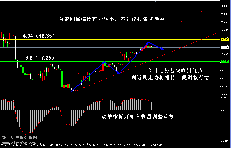 目前紙白銀價格是3.957克。昨日白銀價格小幅回落,但并未顯示空頭力量增強的跡象,銀價觸底后快速收盤下影線,說明低位買盤仍然較強。目前銀價在上沖中動能雖略有減弱,但并未改變前期多頭格局,行情即使出現回調,本周的極限空間預計不會跌破3.8(17.25)的頸線支撐,投資者在該點位上方的支撐位應繼續采取分批布局多單的策略。如下圖所示為白銀日線走勢圖,圖中紅線通道顯示當前銀價仍處于上升通道內運行,且藍色箭頭顯示走勢正處于進三退一的上漲格局之中。近期行情無論調整幅度如何,我們均可將此次回撤視為行情回踩蓄力多頭的動作,其越靠近趨勢線附近,則支撐力度將越強。今日投資者注意觀察銀價收盤情況,若日內行情向下繼續回落跌破昨日低點并收陰,則近期行情將出現一輪調整走勢,這種調整可能是連續性回踩支撐,也可能是小幅回踩后維持橫盤震蕩;若今日行情繼續強勢收陽,短線走勢可能會等待銀價反彈至4.04(18.35)附近才迎來較大回調。有一點值得注意的是,目前日線動能指標已經開始收量,暗示多頭力量確有減弱,此時不可追多,建議回落后分批買入即可。另外,趨勢行情未結束,走勢也未形成頭部形態,故而此時亦不可盲目做空。整體思路暫時維持回調中分批買入的策略不變,根據近兩日收盤情況再做下一步短線策略改變。綜合分析,在趨勢行情中,我們建議投資者以“波段”操作為主,趁著趨勢行情震蕩上行的步伐,投資者可在回落中買入多單,在拉升中盈利,直至趨勢發生反轉為止,如此能將趨勢行情的利潤最大化。對于震蕩行情可采取高拋低吸的策略應對,但對于趨勢行情并不建議采取如此策略,因此近期行情若發生回調,投資者需謹慎做空。(注: 由于紙白銀價格是國際銀價換算而來,而換算過程中涉及到人民幣對美元匯率的變化,即使在國際銀價不變化的情況下,如果人民幣貶值或升值,也會導致紙白銀價格出現變動。因此,我們的分析只采用最新的國際銀價對應的人民幣白銀價格,如與過去分析價格有出入, 投資者應知曉其原因。)