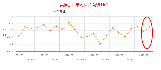 屆時,如果美聯儲真的3期加息,就表明美聯儲加息確實比市場預想的還要激進,那么就不能排除其未來連續加息的可能,市場將開始對2017年另外兩次加息和2018年的三次加息計價,相應的資產價格也將面臨大調整,美元、美股將受提振重振雄風,美債收益率全面上升,而金銀將迎來2017年重要轉折點,中下行情大概率上將開啟。 美國2月就業市場狀況指數(LMCI) 3月13日,美聯儲將公布12月就業市場狀況指數(簡稱“LMCI”),前值為1.3。就業市場狀況指數揭示了美聯儲對就業情況的解讀,對于市場了解美聯儲對就業市場的態度非常重要,美聯儲也曾多次表示該指數比非農數據更加真實地反映出勞動力市場狀況。