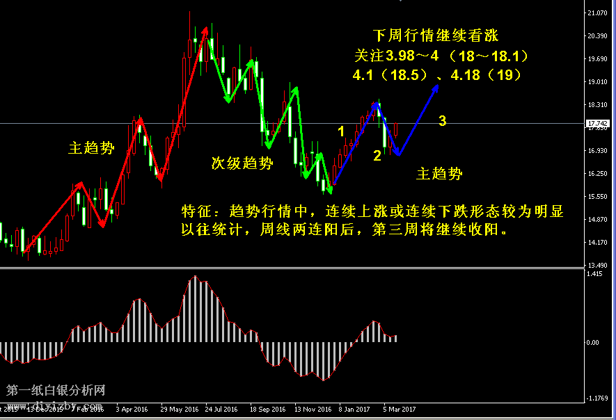 目前紙白銀價格是3.922元/克。本周白銀價格繼續收陽,正如之前所說,銀價上周已經完成了“空轉多”的趨勢變化,這種變化是短期調整結束,中期再度上漲的信號,中線行情進入三浪拉升階段,后市目標將直指4.18(19)附近的趨勢阻力。如下圖所示為白銀周線走勢圖,以大趨勢角度來看,圖中紅色箭頭所示為主升浪上漲,綠色箭頭所示為次級趨勢下跌,而當前藍色箭頭顯示銀價再次回歸到主升浪上漲之中,該上漲形態將在2017年上半年作為主要行情。2017年初至今銀價已經走完了圖中藍色箭頭所示的1浪上漲和2浪下跌,近兩周開始進入第3浪上漲之中。由過去行情走勢的特征來看,趨勢行情中一旦出現兩周收陽,則暗示一輪連續性上漲就將開始,第三周繼續收陽的概率很大。因此,下周整體走勢我們仍然繼續看漲,上方目標將關注3.94(17.8)、3.98~4(18~18.1)、4.1(18.5)、4.18(19)三線壓力,第三浪上漲的最大阻力我們建議關注4.18(19)附近。綜合分析,本周行情強勢收陽說明多頭力量已經完成復蘇,隨著動能指標繼續在零軸上方放量,未來1~2周銀價繼續上沖中線壓力4.18(19)的概率極大。建議投資者繼續持有多單為主,若見回落則均是逢低買入多單的良好時機。以上建議僅供參考, 不作為下單依據。