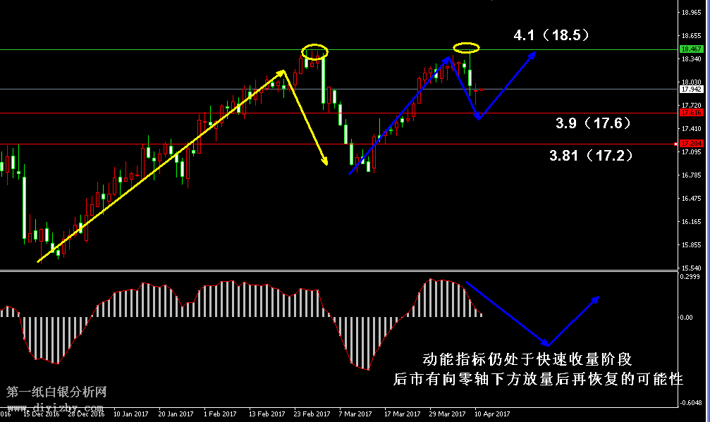 今日下方關(guān)鍵支撐位3.9(17.6)、3.85(17.4)、3.81(17.2)、3.72(16.8);今日上方關(guān)鍵阻4.01(18.1)、4.05(18.3)、4.1(18.5)、4.18(19)。 技術(shù)僅僅是基于概率論和統(tǒng)計(jì)學(xué)的一種綜合分析手段,絕非預(yù)測。所以技術(shù)分析是在考慮做好止損的情況下去博取大概率事件,投資不可過于迷信技術(shù)分析。(短線操作請一定做好止損,一旦被損,代表分析師基于概率和統(tǒng)計(jì)的技術(shù)分析不適用于當(dāng)前行情) 1、紙白銀短線看點(diǎn)位,中線做方向。 2、以上所有價(jià)格為工商銀行買入價(jià),即紙白銀低價(jià)。進(jìn)倉點(diǎn)位要再加0.04,出倉則不要。 3、第一紙白銀給出的所有建議僅供投資者參考,不作為下單絕對依據(jù),切勿過于依賴。 4、北京時(shí)間07:00發(fā)布此文章。 5、上一交易日白銀價(jià)格分析情況:(4月10日)白銀短線或維持調(diào)整 中線看漲趨勢仍不變