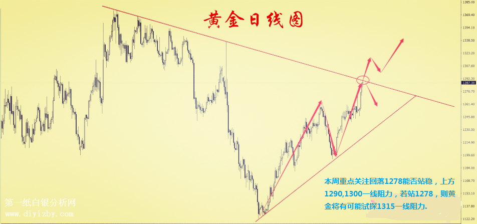 上周回顧: 上周黃金的直線暴漲,短期來看,一方面主要是美國特朗普新政推行受阻,預期落差導致美元指數回落,但美聯儲緊縮貨幣對美元指數仍有支撐,若美聯儲加息、縮表襲來,美指又將沖破阻力,黃金白銀市場必將再遭割肉。另一方面,自去年脫歐公投以來,黃金呈現一直都是供不應求趨勢,公投塵埃落定之后,由于脫歐不確定性仍然籠罩,加上意大利、荷蘭、法國及德國等多國大選來襲以及近期朝韓等政治性問題導致的避險情緒,在某種程度上是支撐著黃金上漲。短期內,黃金白銀呈下跌式瀑布的情況比較小,中長線的來看,還是以多為主。 黃金上周一行情探底1246一線后,尾盤拉回,日線收小陽,周二受特朗普行情影響,黃金在一次站穩(wěn)1264后繼續(xù)拉升,日線收大陽,周三,黃金調整后繼續(xù)走高,特朗普講話為金價帶來支撐,周四,黃金處于高位整理,短線受阻于1290一線,上周周線收大陽,也預示著后市破新高繼續(xù)拉升的可能性加大。 技術分析: 黃金上周受到特朗普的影響,自上周二站穩(wěn)1264后,多頭強勢拉升,從技術結構來看,1264也是多空的分界線,支撐黃金不斷走高,日線呈現多頭排列的走勢,從周線以及日線來看,本次拉升并未結束,早間重點關注1290,1300一線阻力,若站穩(wěn)1264黃金將會開啟新的篇章,目前短線受阻,本周偏震蕩的可能性比較大。 ![]() 操作建議: 黃金直接干多,止損1286,目標看到1290-1300,有效突破我們可以關注1305-1315一線 查看更多紙白銀相關新聞請看:紙白銀行情新聞