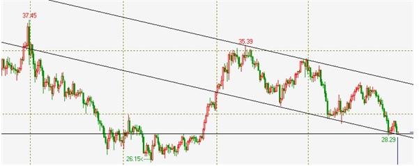 就技術面而言,白銀在連續兩天的下跌之后,又再度回到了之前的28.3位置上下,這個位置在前幾天白銀階段性修正的位置,在技術山屬于下降通道的下軌道和之前的水平支撐交匯的位置,白銀上一次在這里受到支撐短暫反彈,目前白銀重新回到這個位置在技術上仍然存在一定的支撐,但是由于已經反彈過一次,在能量上和市場預期上已經有所消化,因此這一次再度下跌之后,這里的支撐作用將趨于弱化,黃金在最近兩天也結束反彈轉而向下,綜合這些因素,白銀整體的發展態勢上弱勢偏空的格局仍沒有變化。