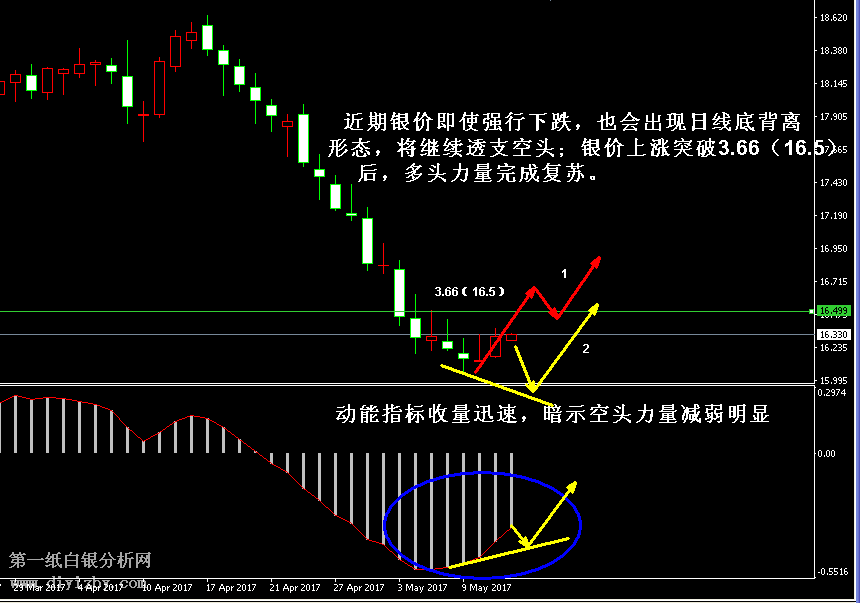 目前紙白銀價(jià)格是3.622克。昨日白銀價(jià)格收陽反彈,是近期銀價(jià)連續(xù)下跌后最大一日上漲行情,不過我們?nèi)孕枥^續(xù)耐心等待走勢向上突破3.66(16.5),一旦突破此處則銀價(jià)將完成止跌反轉(zhuǎn)信號,屆時(shí)多頭力量宣告復(fù)蘇,投資者便可大膽進(jìn)場跟進(jìn)多單。如下圖所示為白銀日線走勢圖,我們近期仍建議以圖中綠線所示處3.66(16.5)為第一信號點(diǎn),如圖中紅色箭頭所示,一旦銀價(jià)直接向上突破該點(diǎn)位,則配合動能指標(biāo)快速收量的情況,則將立即出現(xiàn)“空頭力量衰竭+多頭力量復(fù)蘇”的信號,屆時(shí)投資者便可跟進(jìn)多單;如圖中黃色箭頭所示,另一種情況是先跌后漲,雖然當(dāng)前走勢繼續(xù)向上且動能指標(biāo)也出現(xiàn)明顯收量情況,但在銀價(jià)突破信號點(diǎn)3.66(16.5)之前,由于多頭仍未完全復(fù)蘇,此時(shí)空頭力量存在最后一次砸盤誘空的可能性。如圖中黃色箭頭所示,銀價(jià)可能走出先跌后漲的情況,此種情況走勢將再創(chuàng)新低,不過因空頭力量不足,動能指標(biāo)將無法創(chuàng)出新低,此種情況下行情跌幅有限,而后走勢有望出現(xiàn)觸底反彈格局。第一種情況我們需以3.66(16.5)的突破為信號點(diǎn),第二種情況我們建議等待銀價(jià)回撤至3.52(15.9)附近反手輕倉做多。目前投資者尚不可急于抄底的原因是,走勢尚未走出上述提及的任何一種形態(tài)特征,投資者應(yīng)靜觀行情變化后再下單。綜合分析,根據(jù)近期走勢特征來看,銀價(jià)連續(xù)下跌后力量已經(jīng)明顯不足,多頭略有要復(fù)蘇的跡象,建議投資者此時(shí)不再布局空單,保持觀望態(tài)勢為佳。激進(jìn)者可持有少量空單等待銀價(jià)向上突破信號點(diǎn)3.66(16.5)。(注: 由于紙白銀價(jià)格是國際銀價(jià)換算而來,而換算過程中涉及到人民幣對美元匯率的變化,即使在國際銀價(jià)不變化的情況下,如果人民幣貶值或升值,也會導(dǎo)致紙白銀價(jià)格出現(xiàn)變動。因此,我們的分析只采用最新的國際銀價(jià)對應(yīng)的人民幣白銀價(jià)格,如與過去分析價(jià)格有出入, 投資者應(yīng)知曉其原因。)