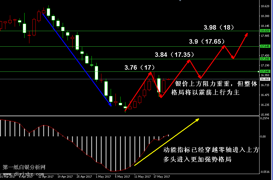 目前紙白銀價格是3.721克。上周五白銀價格強勢收陽,基本收復了前一日的大幅調整,同時銀價也完成了震蕩上行中第一輪“進三退二”中的退二走勢,后市行情將繼續(xù)向上拉升的概率極大,本周繼續(xù)建議投資者逢低分批布局多單,此時行情已經步入上漲格局,在趨勢未發(fā)生轉變之前,投資者堅定持有多單,在任何回落機會中都是分批加倉的良好時機。如下圖所示為白銀日線走勢圖,雖然當前銀價已經轉入震蕩上行步伐,但此前行情產生的一輪大幅下跌仍然對當前走勢構成壓力,如圖中藍色箭頭和綠線所示,銀價前期下跌行情產生了多條阻力線,這是此輪行情上漲過程中銀價可能出現(xiàn)調整的點位。圖中紅色箭頭顯示,當前走勢處于“進三退二”的上漲步伐之中,但瀕臨靠近阻力線附近時,投資者則應警惕追多,可等待行情回撤后繼續(xù)買入多單。上周銀價在3.76(17)附近經歷了第一輪調整行情,此輪上漲將直接沖擊第二阻力3.84(17.35)的概率較大,而后其或再次回踩支撐,如此往復,最終銀價將有望沖向中線阻力4.2(19)附近。近期建議投資者堅定逢低加倉多單即可,目前整體走勢還處于上漲的初始階段,后市依次目標看至3.84(17.35)、3.9(17.65)、3.98(18)幾線。綜合分析,從趨勢角度來看,銀價正處于震蕩上行格局之中,從買盤力量來看,動能指標也才剛剛進入零軸上方,后市仍有繼續(xù)大幅放量的需求。故而當前走勢絕非短暫的反彈行情,而是開始了一輪真正的震蕩上行步伐,基于此,投資者務必繼續(xù)在本周堅定做多思路。(注: 由于紙白銀價格是國際銀價換算而來,而換算過程中涉及到人民幣對美元匯率的變化,即使在國際銀價不變化的情況下,如果人民幣貶值或升值,也會導致紙白銀價格出現(xiàn)變動。因此,我們的分析只采用最新的國際銀價對應的人民幣白銀價格,如與過去分析價格有出入, 投資者應知曉其原因。)