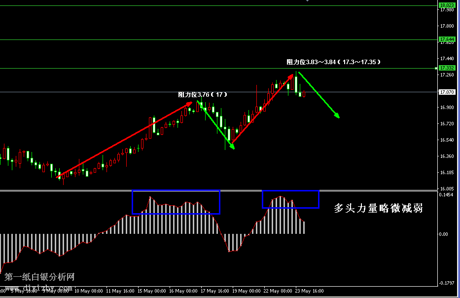 今日下方關鍵支撐位3.73(16.85)、3.71(16.75)、3.67(16.6)、3.59(16.25)、3.52(15.9)、3.45(15.6);今日上方關鍵阻3.84(17.35)、3.9(17.65)、3.98(18)、4.07(18.4)、4.2(19)。 技術僅僅是基于概率論和統計學的一種綜合分析手段,絕非預測。所以技術分析是在考慮做好止損的情況下去博取大概率事件,投資不可過于迷信技術分析。(短線操作請一定做好止損,一旦被損,代表分析師基于概率和統計的技術分析不適用于當前行情) 1、紙白銀短線看點位,中線做方向。 2、以上所有價格為工商銀行買入價,即紙白銀低價。進倉點位要再加0.04,出倉則不要。 3、第一紙白銀給出的所有建議僅供投資者參考,不作為下單絕對依據,切勿過于依賴。 4、北京時間07:00發布此文章。 5、上一交易日白銀價格分析情況:(5月23日)白銀維持進三退二 堅定做多讓利潤奔跑