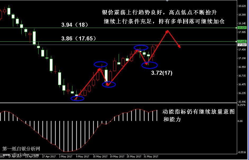 目前紙白銀價格是3.830克。上周五白銀價格在完成調整后大幅上漲,走勢形態上來看,銀價即將展開新一輪拉升,此輪超短線上漲將有望看至3.86(17.65)、3.94(18)兩線目標,其中若銀價能到達3.94(18)附近,則走勢可能因出現較大壓力而再度回落,故而投資者倉位主要可持有至3.94(18)附近獲利減倉。如下圖所示為白銀日線走勢圖,正如圖中紅色箭頭所示,當前銀價維持良好的震蕩上行格局,其中高點和地點均在不斷抬升(藍色圈所示),這是震蕩上行走勢的明顯特征。上周五銀價收陽后,奠定了紅色箭頭中的第三小浪拉升的開始,從動能指標和形態來看,銀價仍然具備繼續上行的條件,其中行情有較大可能直接沖擊至強阻力3.94(18)附近,中途銀價若出現回調,則可繼續分批加倉多單。另外,如圖中藍色圈所示,由于銀價每每上漲其低點也在不斷抬升,故而近期建議投資者可將止損點提升至3.72(17)下方,近期行情不跌破此處,則走勢難出現較大調整。若投資者再次遇到盤中行情小幅調整,則可繼續采取分批2~3分的方式加倉多單即可。綜合分析,目前銀價日線級別以上的走勢形態并無任何見頂跡象,同時,上周五行情強勢拉升也未過度消耗買盤力量,反而激發多頭繼續發力;诖耍局茔y價我們繼續看漲,后市走勢將有望沖擊3.94(18)附近強阻力可能性極大,建議投資者周內思路為先做多為主,等待銀價觸及阻力后再減倉。(注: 由于紙白銀價格是國際銀價換算而來,而換算過程中涉及到人民幣對美元匯率的變化,即使在國際銀價不變化的情況下,如果人民幣貶值或升值,也會導致紙白銀價格出現變動。因此,我們的分析只采用最新的國際銀價對應的人民幣白銀價格,如與過去分析價格有出入, 投資者應知曉其原因。)