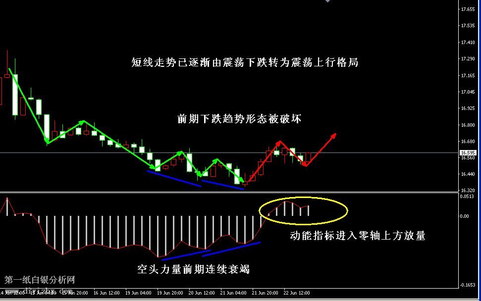 目前紙白銀價格是3.643克。昨日白銀價格收盤小陽線,日K線向上突破了十字星高點,暗示行情經歷連續下跌后出現看漲信號,另外銀價也向上突破了3.65(16.65)的弱信號,說明空頭動能減弱的同時,多頭力量正在不斷增強,上述情況表明銀價具備逐漸止跌企穩的可能性。如下圖所示為白銀4小時周期走勢圖,從短線形態來看,銀價已經完成了震蕩下跌趨勢向震蕩上漲趨勢的轉變,圖中綠色箭頭顯示銀價本周三之前始終維持連續下跌格局,其中高點低點均在不斷下移,且動能處于零軸下方放量。不過當銀價來到支撐位3.59(16.45)附近后,下跌幅度開始減弱,且動能指標出現了連續的底背離形態,暗示空頭力量在支撐位附近出現了明顯的衰竭。昨日行情大幅上漲向上突破了近期小高點3.65(16.65),又表明多頭力量出現顯著增強,同時動能指標也進入零軸上方放量,后市多頭繼續增強的可能性極大。如此以來我們可得出結論,在短線走勢中,銀價不僅僅完成了形態上的趨勢轉換,在多空力量變化中也出現了明顯的反轉跡象——“空頭衰竭的同時,多頭開始復蘇”。雖然昨日銀價突破的點位3.65(16.65)被定義為弱信號點,但投資者已可以開始輕倉買入多單,等待銀價向上突破3.69(16.85)后便可大倉位布局多單,期待新一輪的上行走勢。日內多頭力量仍然充足,投資者可在銀價回調中繼續分批布局多單,倉位控制較輕即可,多單可持倉過周末。綜合分析,正如我們所說,銀價此輪下跌仍然屬于子趨勢的一次回調行情,在其遭遇主趨勢支撐3.59(16.45)的買盤力量后,行情出現了多空力量的轉變,也由此奠定了止跌企穩的事實,后市投資者應轉變思路開始做多,隨著銀價突破阻力越大,倉位可逐漸增加。(注: 由于紙白銀價格是國際銀價換算而來,而換算過程中涉及到人民幣對美元匯率的變化,即使在國際銀價不變化的情況下,如果人民幣貶值或升值,也會導致紙白銀價格出現變動。因此,我們的分析只采用最新的國際銀價對應的人民幣白銀價格,如與過去分析價格有出入, 投資者應知曉其原因。)