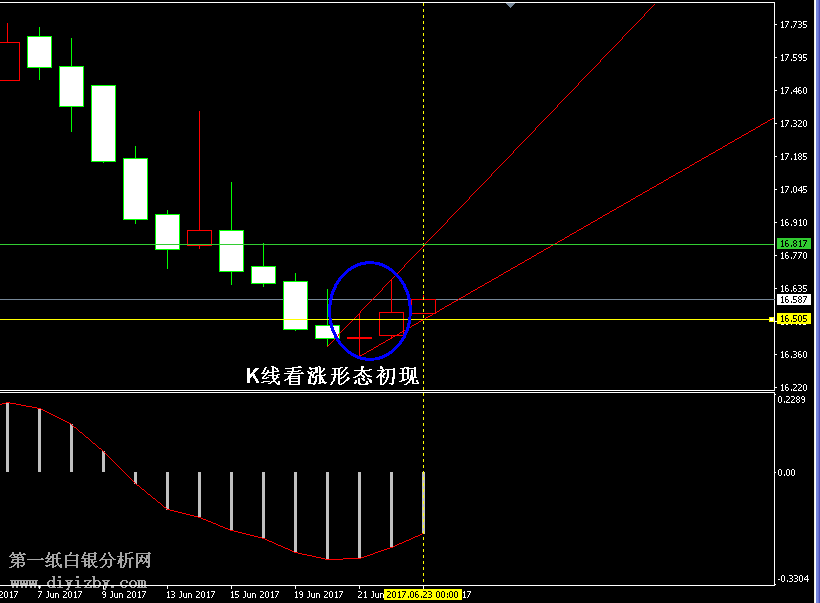 技術僅僅是基于概率論和統計學的一種綜合分析手段,絕非預測。所以技術分析是在考慮做好止損的情況下去博取大概率事件,投資不可過于迷信技術分析。(短線操作請一定做好止損,一旦被損,代表分析師基于概率和統計的技術分析不適用于當前行情) 1、紙白銀短線看點位,中線做方向。 2、以上所有價格為工商銀行買入價,即紙白銀低價。進倉點位要再加點差(各銀行點差不一),出倉則不要。 3、第一紙白銀給出的所有建議僅供投資者參考,不作為下單絕對依據,切勿過于依賴。 4、北京時間09:00發布此文章。 5、上一交易日白銀價格分析情況:(6月22日)白銀空頭力量逐漸減弱 繼續關注反彈力度