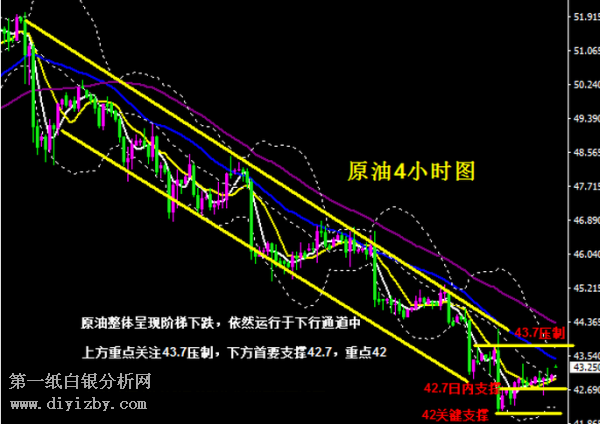 從周線上來看,油價成五連陰走勢,布林帶開口向下拉伸,短期均線死叉向下,周線圖上繼續呈下行趨勢;日線圖上看,油價自5月26日觸及52.0一線高點后開始呈震蕩下行走勢,在上周三觸及布林帶下軌42.0一線后短線止跌,上周四周五延續反彈收陽,目前承壓MA5均線下方,整體空頭趨勢不變;四小時圖來看,油價延續通道內階梯式下行走勢,布林帶呈收口狀,K線運行于布林中軌一線,短期均線偏上行,附圖MACD雙線金叉向上,多頭動能放量,短期油價偏上行風險;綜合來看,原油目前大方向空頭趨勢不變,短線上有反彈需求,反轉目前還言時過早,上方需重點關注43.7一線突破情況,若不破此位,操作上仍以反彈做空為主,下方繼續關注42-42.2支撐一線。