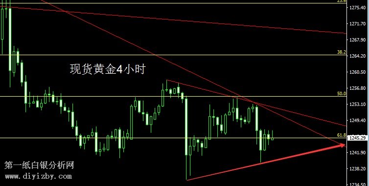 從4小時的形態看,昨日的行情開盤在1249的位置后行情先拉升,歐盤開始時段最高觸及到了1253.1的位置后行情遇阻本輪下降壓力線壓力以及超跌反彈的影響4小時行情行程高位遇阻十字星后行情快速回落,4小時行程大陰線后行情跌破本輪短期上行趨勢,到美盤時段行情最低給到了1239.6的位置后行情受到支撐開始反彈,最終日線收線在了本輪上行斐波那契的61.8支撐點1245的位置后日線以一根下影線長于上影線的紡錘日線收尾,而這樣的形態收尾后,今日月線和周線收關是關鍵,操作上延續區間思路,點位上,今日的行情如果直接給出1250附近空,止損1254,下方目標看1245和1241附近,跌破的話本輪短期三角支撐破壞空單保本持有。