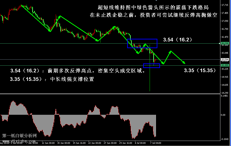 技術(shù)僅僅是基于概率論和統(tǒng)計(jì)學(xué)的一種綜合分析手段,絕非預(yù)測。所以技術(shù)分析是在考慮做好止損的情況下去博取大概率事件,投資不可過于迷信技術(shù)分析。(短線操作請(qǐng)一定做好止損,一旦被損,代表分析師基于概率和統(tǒng)計(jì)的技術(shù)分析不適用于當(dāng)前行情) 1、紙白銀短線看點(diǎn)位,中線做方向。 2、以上所有價(jià)格為工商銀行買入價(jià),即紙白銀低價(jià)。進(jìn)倉點(diǎn)位要再加點(diǎn)差(各銀行點(diǎn)差不一),出倉則不要。 3、第一紙白銀給出的所有建議僅供投資者參考,不作為下單絕對(duì)依據(jù),切勿過于依賴。 4、北京時(shí)間09:00發(fā)布此文章。 5、上一交易日白銀價(jià)格分析情況:(7月7日)白銀閃崩強(qiáng)化跌勢 非農(nóng)僅指引超短線方向