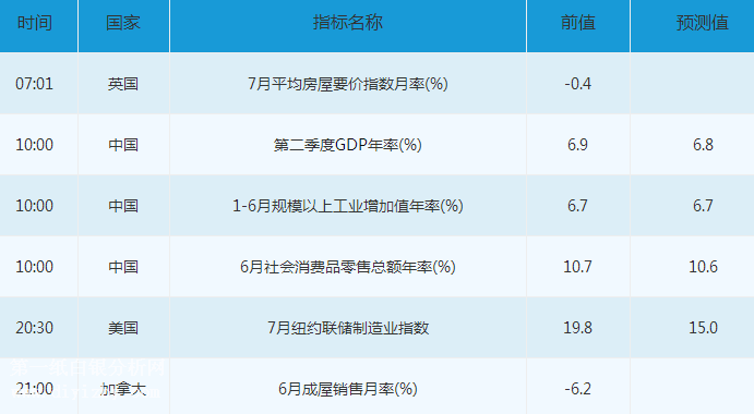 北京時間10點整,投資者需要密切關注中國二季度GDP數據的表現,同時中國國家統計局還會召開上半年的國民經濟運行情況發布會,中國GDP數據和發布會的情況將會影響整個亞洲時段全球市場的風險偏好情緒。