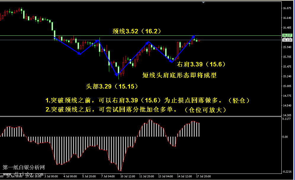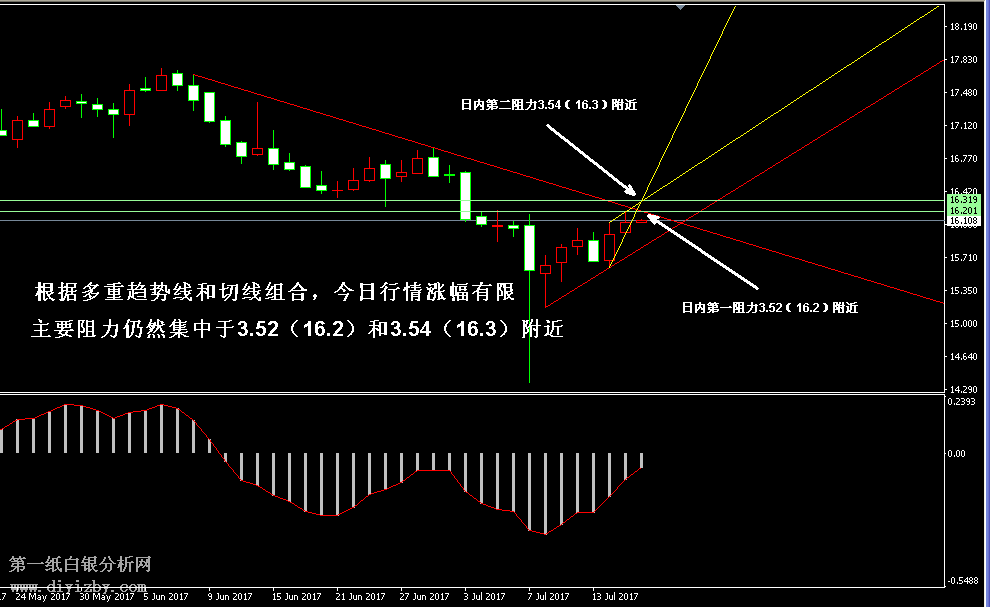 技術僅僅是基于概率論和統計學的一種綜合分析手段,絕非預測。所以技術分析是在考慮做好止損的情況下去博取大概率事件,投資不可過于迷信技術分析。(短線操作請一定做好止損,一旦被損,代表分析師基于概率和統計的技術分析不適用于當前行情) 1、紙白銀短線看點位,中線做方向。 2、以上所有價格為工商銀行買入價,即紙白銀低價。進倉點位要再加點差(各銀行點差不一),出倉則不要。 3、第一紙白銀給出的所有建議僅供投資者參考,不作為下單絕對依據,切勿過于依賴。 4、北京時間07:00發布此文章。 5、上一交易日白銀價格分析情況:(7月17日)白銀短線逐漸轉入震蕩上行 關注突破企穩