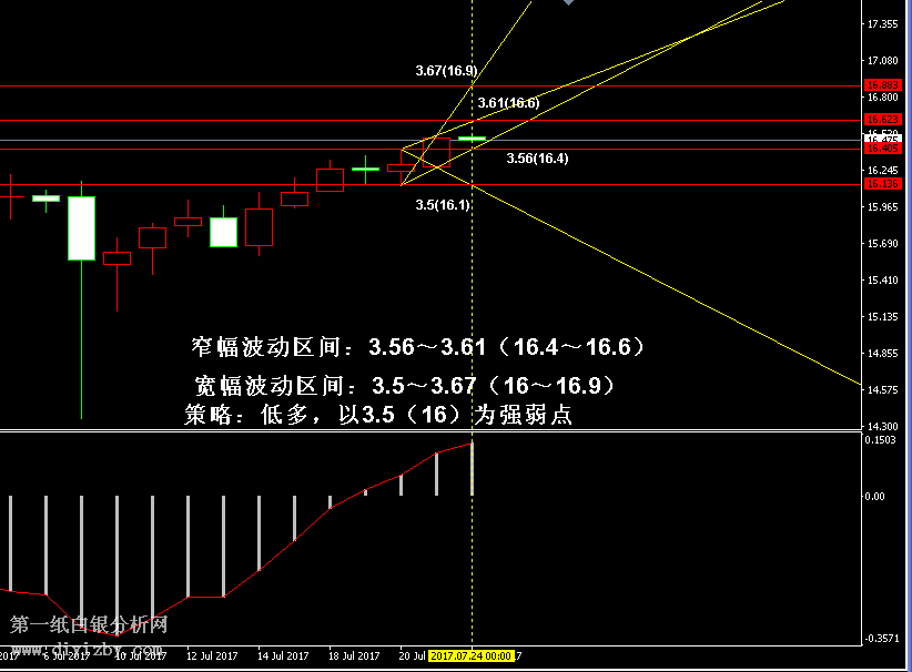 技術僅僅是基于概率論和統計學的一種綜合分析手段,絕非預測。所以技術分析是在考慮做好止損的情況下去博取大概率事件,投資不可過于迷信技術分析。(短線操作請一定做好止損,一旦被損,代表分析師基于概率和統計的技術分析不適用于當前行情) 1、紙白銀短線看點位,中線做方向。 2、以上所有價格為工商銀行買入價,即紙白銀低價。進倉點位要再加點差(各銀行點差不一),出倉則不要。 3、第一紙白銀給出的所有建議僅供投資者參考,不作為下單絕對依據,切勿過于依賴。 4、北京時間07:30發布此文章。 5、上一交易日白銀價格分析情況:(7月21日)白銀短線買盤力量減弱 上漲緩慢防止調整