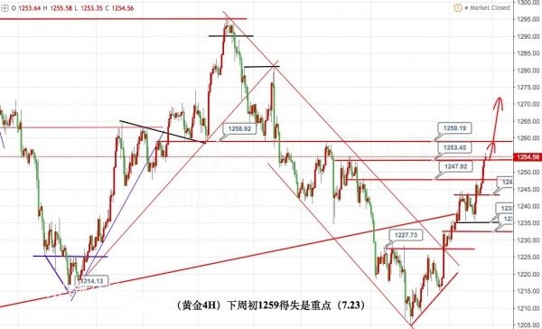 1:上周黃金在前一周周五破位1228后借勢一路上攻,如圖連續打破盤中多條重要阻力線!