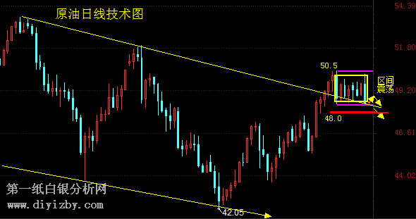 原因技術(shù)面解析:從日線上不難看出,原油這一周絕大多數(shù)時(shí)段都波動(dòng)在48.5至51美元之間,收線方面也是呈現(xiàn)出一陰一陽(yáng),間隔穿插收線的局面,可以說本周原油的走勢(shì)相當(dāng)類似,漲一天跌一天的。目前日線布林帶開口有所收縮,,油價(jià)運(yùn)行于中軌偏上方的位置,中軌聯(lián)合斐波那契回調(diào)線38.2%在48.3的位置提供支撐位,上方5日及10日均線死叉下行,并在49.1附近存在阻力位,MACD上快慢線死叉下行,下行動(dòng)能柱再次開始放量,空頭氣息彌漫;