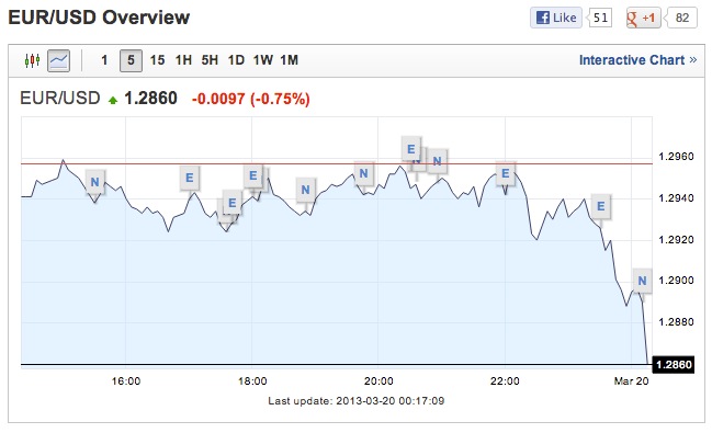 更新一:北京時間3月20日凌晨2點20分 塞浦路斯議會投票否決存款稅:36票反對,19票棄權(quán),0票同意。 開放歐洲認為,歐盟很可能會給塞浦路斯更多時間尋找解決58億歐元資金缺口的問題,包括再次就存款稅舉行議會投票。 塞浦路斯財長將在周三向俄羅斯提交一份計劃,希望俄羅斯拯救其銀行部門。 塞浦路斯官方表示,財長Michalis Sarris在企業(yè)代表的陪同下,準備與俄羅斯做一筆交易。交易包括,對俄羅斯人在塞浦路斯的存款征收20%-30%的存款稅,這會導致俄羅斯人損失數(shù)十億美元。作為交換,塞浦路斯將會給予俄羅斯未來天然氣開采企業(yè)的股權(quán)和一些能源部門額外的戰(zhàn)略性利益,同時俄羅斯投資者將控制塞浦路斯銀行的董事會。 然而,現(xiàn)在看來這筆交易的成功幾率并不大。在塞浦路斯財長出訪俄羅斯前,俄羅斯發(fā)言人就表示:“沒有細節(jié)是不可能展開談判的。” 塞浦路斯總統(tǒng)暗示,政府正在制定“方案B”。他表示:“我們有我們的計劃。” 德國發(fā)言人態(tài)度堅決,表示絕不放松救助條件。 北京時間3月19日晚11點30分 據(jù)消息人士表示,塞浦路斯財長提交辭職申請。 隨后媒體報道塞浦路斯總統(tǒng)Anastasiades拒絕財長辭職申請。 北京時間周二晚上約12點傳出突發(fā)消息,塞浦路斯議會準備就存款稅投票,據(jù)道瓊斯報道,之前愿意投贊成票的執(zhí)政黨將投棄權(quán)票,這意味著沒有議員愿意支持存款稅。 歐元下跌,兌美元跌破1.29