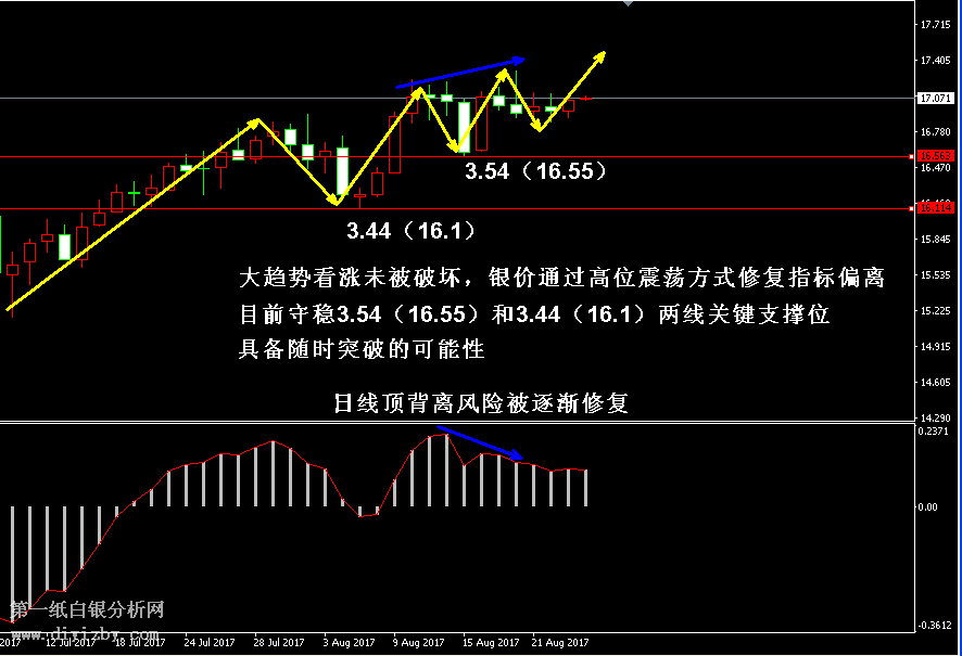 技術僅僅是基于概率論和統計學的一種綜合分析手段,絕非預測。所以技術分析是在考慮做好止損的情況下去博取大概率事件,投資不可過于迷信技術分析。(短線操作請一定做好止損,一旦被損,代表分析師基于概率和統計的技術分析不適用于當前行情) 1、紙白銀短線看點位,中線做方向。 2、以上所有價格為工商銀行買入價,即紙白銀低價。進倉點位要再加點差(各銀行點差不一),出倉則不要。 3、第一紙白銀給出的所有建議僅供投資者參考,不作為下單絕對依據,切勿過于依賴。 4、北京時間07:50發布此文章。 5、上一交易日白銀價格分析情況:(8月23日)白銀趨勢未變動能不足 短線行情震蕩繼續