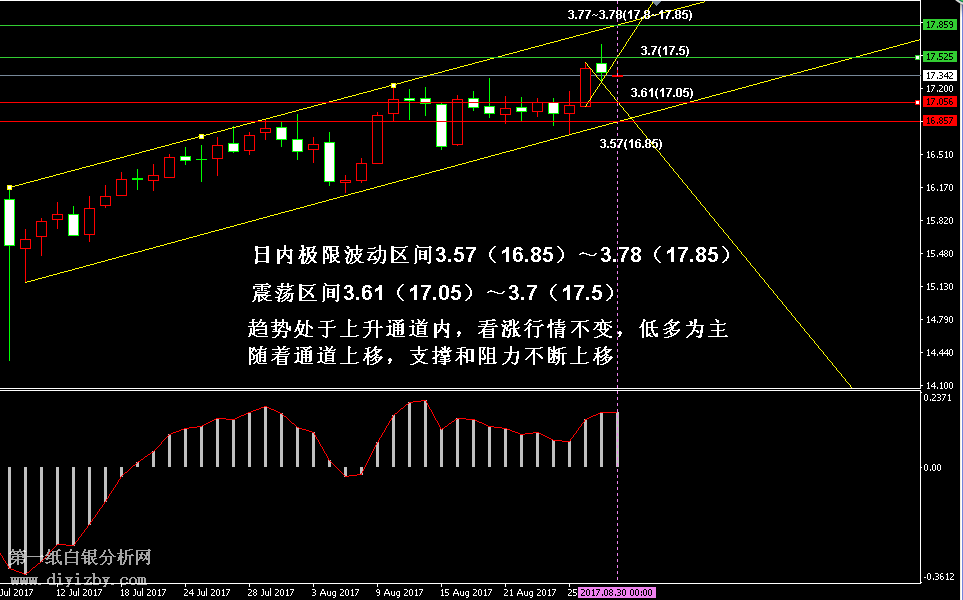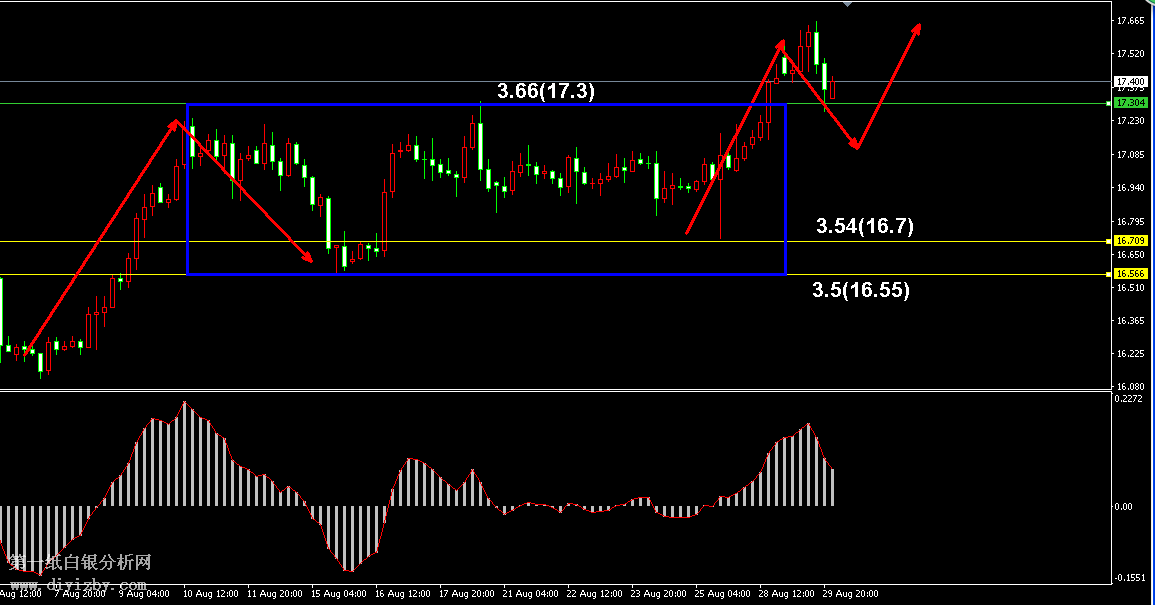技術僅僅是基于概率論和統計學的一種綜合分析手段,絕非預測。所以技術分析是在考慮做好止損的情況下去博取大概率事件,投資不可過于迷信技術分析。(短線操作請一定做好止損,一旦被損,代表分析師基于概率和統計的技術分析不適用于當前行情) 1、紙白銀短線看點位,中線做方向。 2、以上所有價格為工商銀行買入價,即紙白銀低價。進倉點位要再加點差(各銀行點差不一),出倉則不要。 3、第一紙白銀給出的所有建議僅供投資者參考,不作為下單絕對依據,切勿過于依賴。 4、北京時間07:50發布此文章。 5、上一交易日白銀價格分析情況:(8月29日)白銀空中加油完成 擺脫震蕩重回強勢上漲