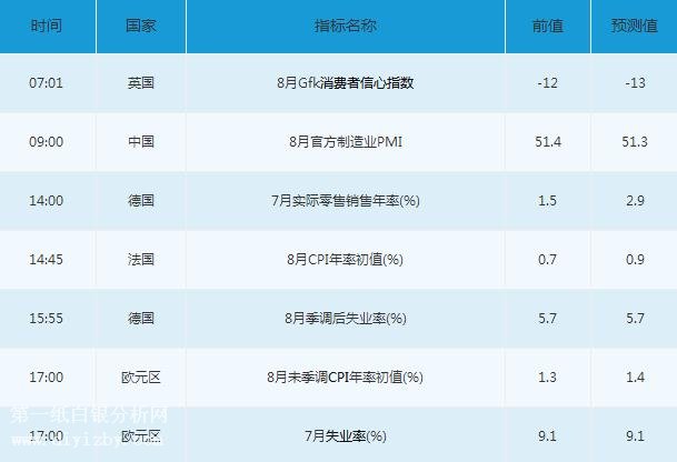 周四(8月31日)亞洲時段,投資者首先關(guān)注07:01公布的英國8月Gfk消費者信心指數(shù)。到了09:00,投資者可關(guān)注中國8月官方制造業(yè)PMI。