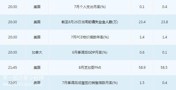 美國時段,投資者首先需關(guān)注20:30公布的美國7月PCE物價指數(shù)年率。此外,同一時間將公布美國7月個人支出月率、美國截至8月26日當(dāng)周初請失業(yè)金人數(shù)、加拿大6月季調(diào)后GDP年率也值得投資者關(guān)注。