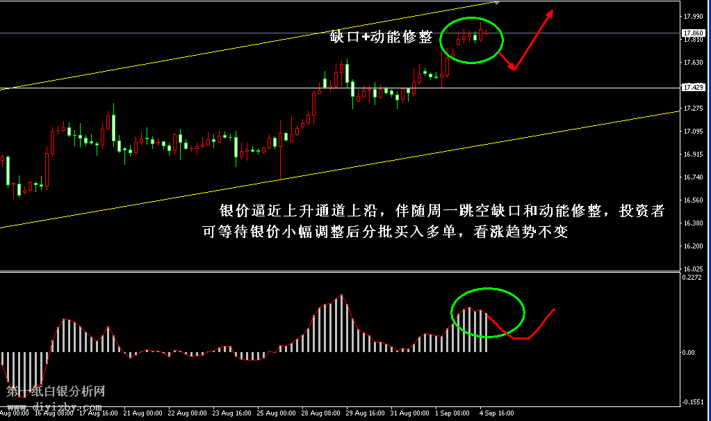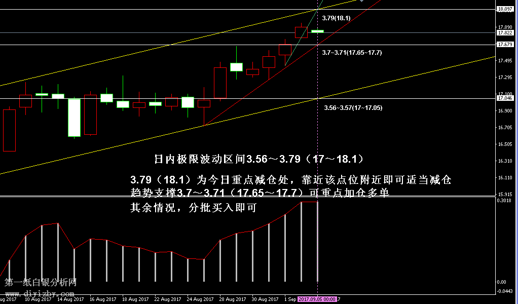 技術僅僅是基于概率論和統計學的一種綜合分析手段,絕非預測。所以技術分析是在考慮做好止損的情況下去博取大概率事件,投資不可過于迷信技術分析。(短線操作請一定做好止損,一旦被損,代表分析師基于概率和統計的技術分析不適用于當前行情) 1、紙白銀短線看點位,中線做方向。 2、以上所有價格為工商銀行買入價,即紙白銀低價。進倉點位要再加點差(各銀行點差不一),出倉則不要。 3、第一紙白銀給出的所有建議僅供投資者參考,不作為下單絕對依據,切勿過于依賴。 4、北京時間08:00發布此文章。 5、上一交易日白銀價格分析情況:(9月4日)白銀趨勢延續大幅拉升 動能充足繼續看漲