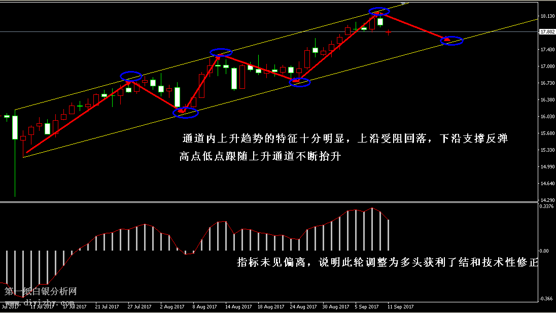 目前紙白銀價格是3.753元/克。上周五白銀價格沖高回落,銀價在靠近上升通道上沿壓力后最終出現(xiàn)有效回調(diào),暗示近期行情技術(shù)性修正的可能性較大,但走勢向下回落仍僅僅限于調(diào)整,并未改變主趨勢上行格局,建議投資者在此輪調(diào)整走勢中以分批布局多單思路為主,待銀價釋放完畢空頭力量和積蓄買盤動能后,再次上漲將突破近期高點。如下圖所示為白銀日線走勢圖,從趨勢角度來看,當(dāng)前銀價正維持良好的上升格局,圖中黃線所示為日線趨勢的上升通道形態(tài),目前白銀在該上升通道內(nèi)的走勢特征十分明顯。每當(dāng)銀價拉升至通道高點阻力后便沖高回落,回踩通道低點支撐后又再度上漲,如此往復(fù)令行情高點和低點跟隨通道不斷抬升,形成了“進(jìn)三退二”式上漲。我們可以從紅色箭頭的上升趨勢中得出,每一次行情回落都是為了下一次更大幅度的拉升作出準(zhǔn)備,如果在回調(diào)中積極布局多單,則下一次趨勢拉升后的多頭利潤將是極其豐厚的。另外,從動能指標(biāo)形態(tài)來看,近期動能指標(biāo)出現(xiàn)收量,但此次收量并非因指標(biāo)偏離而引發(fā),實則是白銀多頭高位獲利和空頭阻力打壓所致,非指標(biāo)偏離所發(fā)生的回落往往都是正常的技術(shù)性回調(diào),故而推測此輪調(diào)整風(fēng)險不會改變銀價主趨勢看漲格局。換言之,此輪行情調(diào)整修復(fù)完畢后,走勢再度拉升創(chuàng)出新高的可能性較大;注意,銀價雖然有回踩通道下沿的需求,但多頭趨勢強(qiáng)勁,且通道隨著時間推遲不斷上移,行情回踩幅度未必會很大,投資者切勿盲目做空。本周銀價若出現(xiàn)調(diào)整,則是給予投資者在低位布局多單的良好時間,建議采取分批補(bǔ)倉多單的方式布局,若遇到支撐位則重點加倉即可,多單可止損前一輪通道下沿支撐3.48(16.7)下方。綜合分析:圖中紅色箭頭所示的走勢也是一種“階梯式上漲”,當(dāng)銀價再創(chuàng)新高后,則暗示下一輪調(diào)整并不會跌破前一輪調(diào)整的低點(此輪上漲的起點),通俗的解釋,此輪銀價回落不會跌破3.48(16.7)上一輪行情回踩通道下沿,故而投資者凡是做多,則均以此點位為止損點;另外,此輪調(diào)整完畢后,下一輪上漲必然突破此輪上漲高點。走勢通過“階梯式上漲”的方式,將中線上漲趨勢延續(xù)下去,投資者可不斷上移中線多單止損點至前一浪回調(diào)低點下方,只要趨勢不斷上漲,則多單不會被止損,一旦最終被止損(跟隨趨勢不斷上移止損點,一旦止損則代表趨勢反轉(zhuǎn)),投資者實則已經(jīng)獲得了最大的利潤。(注: 由于紙白銀價格是國際銀價換算而來,而換算過程中涉及到人民幣對美元匯率的變化,即使在國際銀價不變化的情況下,如果人民幣貶值或升值,也會導(dǎo)致紙白銀價格出現(xiàn)變動。因此,我們的分析只采用最新的國際銀價對應(yīng)的人民幣白銀價格,如與過去分析價格有出入, 投資者應(yīng)知曉其原因。)