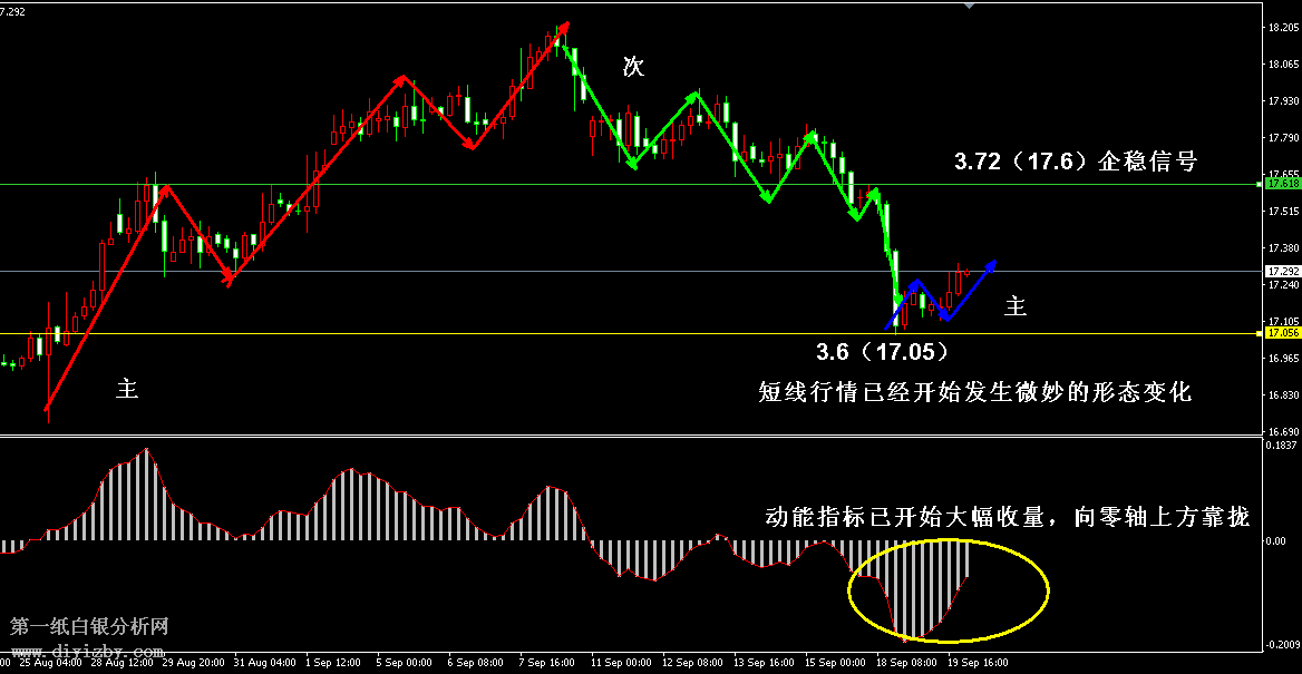 目前紙白銀價(jià)格是3.656元/克。昨日白銀價(jià)格觸底反彈,這驗(yàn)證了3.6(17.05)強(qiáng)支撐的有效性,后市行情圍繞該點(diǎn)位形成企穩(wěn)并展開(kāi)新一輪上漲的可能性依舊很大,投資者近期密切關(guān)注企穩(wěn)信號(hào)3.72(17.6)的突破,若銀價(jià)突破該點(diǎn)位,則暗示行情調(diào)整完成,同時(shí)將啟動(dòng)新一輪上漲走勢(shì)。如下圖所示為白銀日線(xiàn)走勢(shì)圖,近期銀價(jià)走勢(shì)已經(jīng)開(kāi)始發(fā)生微妙的變化,從中或可以捕捉到行情重啟上漲的一些蛛絲馬跡。圖中紅色箭頭顯示當(dāng)前銀價(jià)的主趨勢(shì)上漲,綠色箭頭顯示了銀價(jià)的次級(jí)趨勢(shì)調(diào)整,當(dāng)次級(jí)趨勢(shì)遭遇主趨勢(shì)強(qiáng)支撐后,行情將有望逐漸順應(yīng)主趨勢(shì)而波動(dòng)。自從本周一銀價(jià)向下回踩了強(qiáng)支撐3.6(17.05)后,昨日行情出現(xiàn)較大反彈,且從圖中藍(lán)色箭頭來(lái)看,此次反彈已經(jīng)有形成獨(dú)自上漲浪特征的跡象,而該上漲與紅色箭頭所示的主趨勢(shì)上漲相呼應(yīng)。若圖中藍(lán)色箭頭所示的上漲形態(tài)得以延續(xù),我們不難發(fā)現(xiàn),新一輪拉升行情將由此展開(kāi),并圍繞近期回落低點(diǎn)3.6(17.05)形成底部。雖然真正的企穩(wěn)信號(hào)還需參考近期下跌高點(diǎn)3.72(17.6)的突破,但在此之前銀價(jià)實(shí)際上很可能已經(jīng)完成企穩(wěn),只是市場(chǎng)還未給出明確信號(hào),而3.72(17.6)的突破將確認(rèn)這一事實(shí)。另外,從動(dòng)能指標(biāo)形態(tài)來(lái)看,昨日行情反彈后,動(dòng)能指標(biāo)開(kāi)始在零軸下方大幅收量,這說(shuō)明市場(chǎng)的空頭力量開(kāi)始快速減弱,多頭有所增強(qiáng),符合走勢(shì)在支撐位反彈的特征。綜合分析:昨日的反彈行情雖然未能證明銀價(jià)已經(jīng)完成調(diào)整,但驗(yàn)證了3.6(17.05)強(qiáng)支撐的有效性,且行情正發(fā)生微妙變化形成獨(dú)自的上升形態(tài)。為了確認(rèn)企穩(wěn),近期投資者可密切關(guān)注3.72(17.6)的突破,突破后銀價(jià)將展開(kāi)新一輪拉升,屆時(shí)行情有望突破前期高點(diǎn)3.86(18.25),并測(cè)試年內(nèi)最高點(diǎn)3.94(18.65)。在銀價(jià)突破信號(hào)點(diǎn)之前,投資者應(yīng)適當(dāng)持有一部分多單,由于趨勢(shì)看漲未改變,此時(shí)仍然是分批建倉(cāng)的較佳時(shí)機(jī)。(注: 由于紙白銀價(jià)格是國(guó)際銀價(jià)換算而來(lái),而換算過(guò)程中涉及到人民幣對(duì)美元匯率的變化,即使在國(guó)際銀價(jià)不變化的情況下,如果人民幣貶值或升值,也會(huì)導(dǎo)致紙白銀價(jià)格出現(xiàn)變動(dòng)。因此,我們的分析只采用最新的國(guó)際銀價(jià)對(duì)應(yīng)的人民幣白銀價(jià)格,如與過(guò)去分析價(jià)格有出入, 投資者應(yīng)知曉其原因。)