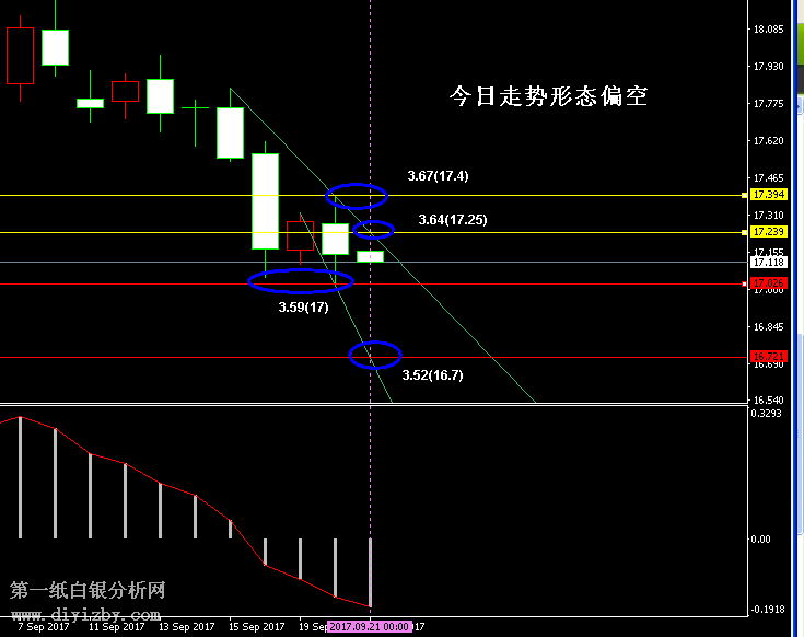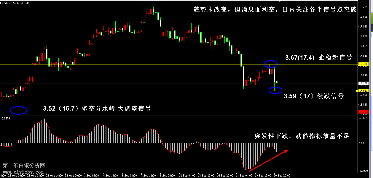 技術(shù)僅僅是基于概率論和統(tǒng)計學(xué)的一種綜合分析手段,絕非預(yù)測。所以技術(shù)分析是在考慮做好止損的情況下去博取大概率事件,投資不可過于迷信技術(shù)分析。(短線操作請一定做好止損,一旦被損,代表分析師基于概率和統(tǒng)計的技術(shù)分析不適用于當(dāng)前行情) 1、紙白銀短線看點位,中線做方向。 2、以上所有價格為工商銀行買入價,即紙白銀低價。進(jìn)倉點位要再加點差(各銀行點差不一),出倉則不要。 3、第一紙白銀給出的所有建議僅供投資者參考,不作為下單絕對依據(jù),切勿過于依賴。 4、北京時間08:00發(fā)布此文章。 5、上一交易日白銀價格分析情況:(9月20日)白銀觸底反彈驗證支撐 靜待企穩(wěn)信號出現(xiàn)