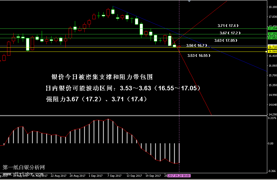 技術僅僅是基于概率論和統計學的一種綜合分析手段,絕非預測。所以技術分析是在考慮做好止損的情況下去博取大概率事件,投資不可過于迷信技術分析。(短線操作請一定做好止損,一旦被損,代表分析師基于概率和統計的技術分析不適用于當前行情) 1、紙白銀短線看點位,中線做方向。 2、以上所有價格為工商銀行買入價,即紙白銀低價。進倉點位要再加點差(各銀行點差不一),出倉則不要。 3、第一紙白銀給出的所有建議僅供投資者參考,不作為下單絕對依據,切勿過于依賴。 4、北京時間08:00發布此文章。 5、上一交易日白銀價格分析情況:(9月27日)白銀震蕩區間內反復 靜待突破后順勢跟進
