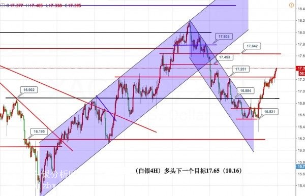 4:白銀整體反彈的力度和幅度比黃金強,高點下跌以來的反彈0.5阻力點已經被突破,如圖解下來關鍵阻力位于17.65位置!