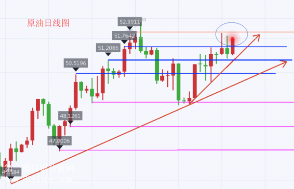 回踩52附近多,止損51.5,上方目標看52.5,破位主要看頸線52.86的得失,如果能有效站穩的話那么行情將沖擊55關口。