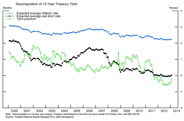 美聯儲退出QE存在非常多的問題,Gavyn Davies在FT專欄中對此問題進行了詳細的分析: 第一個問題是,美聯儲退出刺激計劃會是逐漸的過程還是突然的終止。美聯儲主席伯南克的個人傾向一直很明確:退出應該是循序漸進的,而且應該提前讓市場知道這一信號。但是明年1月之后,伯南克就不是美聯儲的人了,而美聯儲內部的其他人可能會有不同意見。 另外,到時候,經濟和市場的環境都有可能出現變化。1994年,美國GDP增速和通脹水平都顯著上漲,但是美聯儲在毫無警告的情況下就戛然叫停了對經濟的刺激。最終聯邦基準利率上漲3%導致了一場金融系統的劇烈震蕩。 美聯儲總是在試圖避免讓這些錯誤重演。1994年,當時的美聯儲主席格林斯潘和同事們認為,貨幣政策已經落后于此前的經濟周期曲線了,于是他們用出乎意料的行動做出了政策上的轉變,當然,他們也看到了這樣做能夠讓美聯儲對市場的影響達到最大化。但是這對于洋洋得意的金融系統造成了極其嚴重的后果,那時候的債券交易員至今還會想起關于1994年的噩夢。 后來,格林斯潘又迎來了下一個收緊政策的機會,那是在2004年,他向市場保證,這一次會是一個逐漸發生的過程。然而結果呢?房地產泡沫和信貸泡沫基本上就在美聯儲的眼皮底下開始膨脹。 圣路易斯聯儲主席James Bullard承認了以前美聯儲的錯誤,但他對如今這一次似乎很樂觀,他承諾這一次美聯儲既不會收得太突然也不會太拖沓。 伯南克在過去至少10年的時間內,在收緊政策的速率問題上態度都很明確。2004年他在一次名為“漸進主義”的演講中,伯南克就主要收緊政策的過程應該是緩慢的,而且要與市場做好溝通,以防止給經濟造成過多不確定性,避免1994年那樣的金融地震。那場演講中,伯南克還表示,如果通脹水平上漲,美聯儲將會更為激進的作出回應,但他沒有提到任何關于金融市場中泡沫的風險。甚至在2007-2008年金融危機時,他也保持著這樣的態度。 美聯儲從最近的嚴重錯誤中學到的一個關鍵教訓就是,其實漸進主義并不是一個錯誤的方式,錯的是催生了過多的金融風險,這些才是應該用更嚴格的監管措施來加以限制的東西。在目前的情況中,這就意味著要直接對一些杠桿程度過高的信貸工具進行控制。 但是伯南克似乎已經決心不僅要繼續堅持在資產負債表和短期利率方面的政策,而且還要堅持對長期利率的控制,所以再出現1994年債券市場那樣的風暴似乎可能性不是那么大了。然而,這種控制長期債券收益率的做法把美聯儲帶入了一個傳統意義上一個央行不會走入的區域,因為一般來講,長期利率應該是由市場來決定的。 在最近題為“長期利率”的演講中,伯南克強調,長期債券的期限溢價(下圖中綠色線條)最近已經降至負領域,這意味著借方更愿意提供周期長回報率低的貸款,然后延期付款。