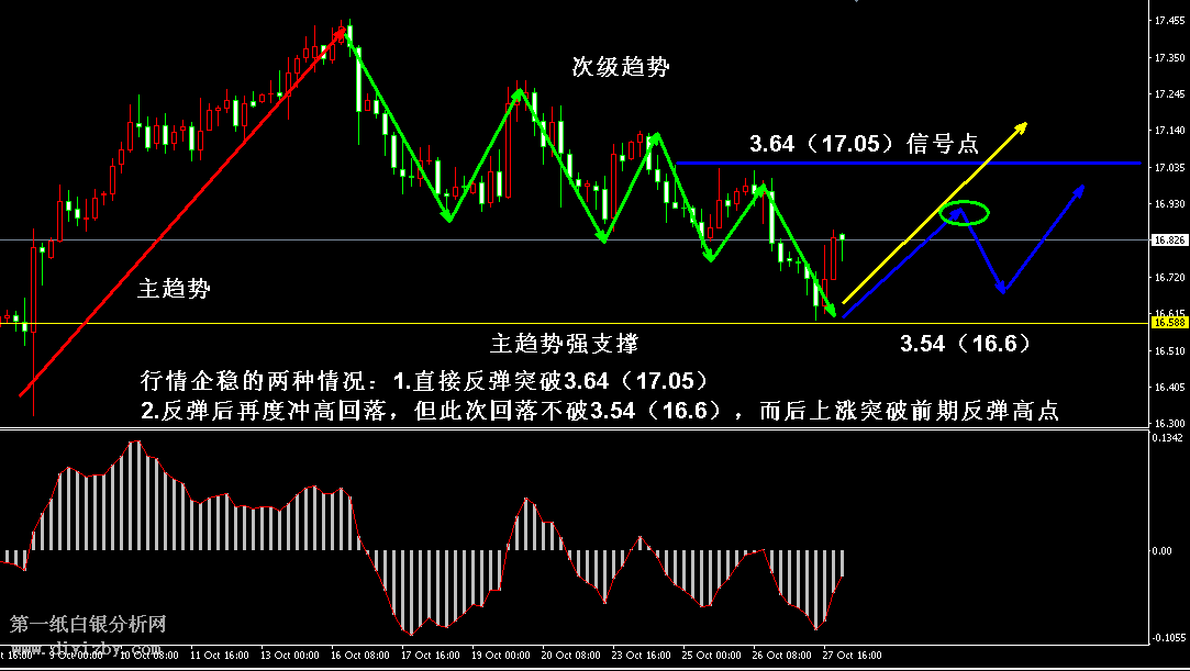 技術僅僅是基于概率論和統計學的一種綜合分析手段,絕非預測。所以技術分析是在考慮做好止損的情況下去博取大概率事件,投資不可過于迷信技術分析。(短線操作請一定做好止損,一旦被損,代表分析師基于概率和統計的技術分析不適用于當前行情) 1、紙白銀短線看點位,中線做方向。 2、以上所有價格為工商銀行買入價,即紙白銀低價。進倉點位要再加點差(各銀行點差不一),出倉則不要。 3、第一紙白銀給出的所有建議僅供投資者參考,不作為下單絕對依據,切勿過于依賴。 4、北京時間08:40發布此文章。 5、上一交易日白銀價格分析情況:(10月27日)白銀下破十字星 中繼下跌形態或繼續回落