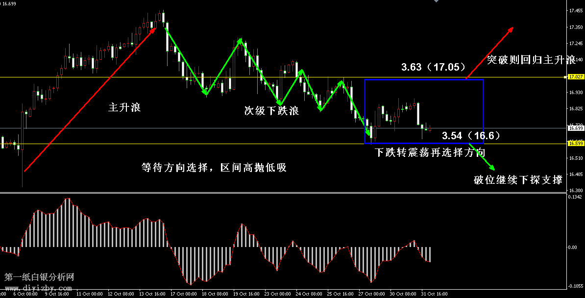 技術(shù)僅僅是基于概率論和統(tǒng)計學(xué)的一種綜合分析手段,絕非預(yù)測。所以技術(shù)分析是在考慮做好止損的情況下去博取大概率事件,投資不可過于迷信技術(shù)分析。(短線操作請一定做好止損,一旦被損,代表分析師基于概率和統(tǒng)計的技術(shù)分析不適用于當前行情) 1、紙白銀短線看點位,中線做方向。 2、以上所有價格為工商銀行買入價,即紙白銀低價。進倉點位要再加點差(各銀行點差不一),出倉則不要。 3、第一紙白銀給出的所有建議僅供投資者參考,不作為下單絕對依據(jù),切勿過于依賴。 4、北京時間08:40發(fā)布此文章。 5、上一交易日白銀價格分析情況:(10月31日)白銀驗證支撐有效性 近期走勢或引發(fā)變盤