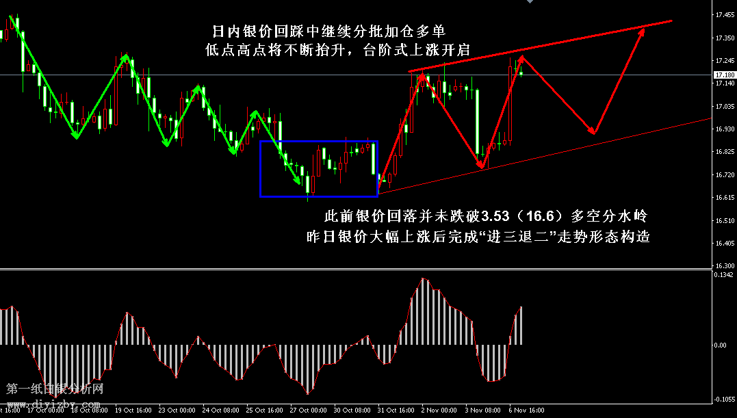 技術(shù)僅僅是基于概率論和統(tǒng)計學(xué)的一種綜合分析手段,絕非預(yù)測。所以技術(shù)分析是在考慮做好止損的情況下去博取大概率事件,投資不可過于迷信技術(shù)分析。(短線操作請一定做好止損,一旦被損,代表分析師基于概率和統(tǒng)計的技術(shù)分析不適用于當前行情) 1、紙白銀短線看點位,中線做方向。 2、以上所有價格為工商銀行買入價,即紙白銀低價。進倉點位要再加點差(各銀行點差不一),出倉則不要。 3、第一紙白銀給出的所有建議僅供投資者參考,不作為下單絕對依據(jù),切勿過于依賴。 4、北京時間08:40發(fā)布此文章。 5、上一交易日白銀價格分析情況:(11月6日)白銀守穩(wěn)多空分水嶺 回落做多仍為主旋律