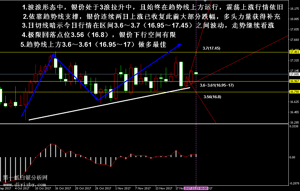 技術僅僅是基于概率論和統計學的一種綜合分析手段,絕非預測。所以技術分析是在考慮做好止損的情況下去博取大概率事件,投資不可過于迷信技術分析。(短線操作請一定做好止損,一旦被損,代表分析師基于概率和統計的技術分析不適用于當前行情) 1、紙白銀短線看點位,中線做方向。 2、以上所有價格為工商銀行買入價,即紙白銀低價。進倉點位要再加點差(各銀行點差不一),出倉則不要。 3、第一紙白銀給出的所有建議僅供投資者參考,不作為下單絕對依據,切勿過于依賴。 4、北京時間08:55發布此文章。 5、上一交易日白銀價格分析情況:(11月22日)白銀沿趨勢線緩慢上漲 多頭格局仍將延續