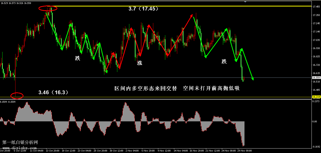 目前紙白銀價格是3.516元/克。昨日白銀價格經歷了跳水行情,銀價向下跌破多空分水嶺3.52(16.6),由此打破了此前高點低點不斷抬升的局面,將走勢從強勢震蕩帶入弱勢震蕩格局,接下來預計行情將暫時在3.46~3.7(16.3~17.45)范圍內波動,該區間內空頭略微強勁,操作上投資者可以短線高拋低吸策略應對,后市應等待該區間突破,待其突破后,銀價多空將順勢打開較大空間。如下圖所示為白銀日線走勢圖,因昨日銀價向下跌破關鍵分水嶺3.52(16.6),走勢已從此前的震蕩緩慢上行轉入弱勢震蕩格局,當前震蕩區間如圖中黃線所示,其震蕩高點為3.7(17.45)的前期起始下跌點位,震蕩低點為3.46(16.3)的前期起始上漲點位,起始上漲和起始下跌點位圈定的區間限制了銀價的波動范圍。從目前走勢和形態來看,我們大致可得出如下結論:1.銀價下跌已經破壞上漲結構,走勢完成“震蕩緩慢上行---弱勢震蕩”的轉變,此時空頭力量略微占優,但受限于大區間還未突破,多空力量均未選擇方向,操作上應暫時保持高拋低吸思路;2.目前銀價將先在3.46~3.7(16.3~17.45)范圍內震蕩,投資者一邊高拋低吸,一邊密切關注行情突破;3.若后市銀價向下破位3.46(16.3),則自10月初以來的反彈行情將宣告結束,空頭力量再度大幅走強,空頭將向下打開空間至3.36(15.85)和3.25(15.3);4.銀價向上破位3.7(17.45),則多頭將向上打開空間至中線壓力的3.75(17.75)附近;5.當銀價在3.46~3.7(16.3~17.45)范圍內震蕩時,此區間內亦有強弱信號點,其中3.66(17.25)的強阻力區域下方為弱勢震蕩區域,銀價未反彈突破該點位之前,投資者應以高拋為主,低吸為輔,此時需謹防行情隨時向下跌破。反之,當銀價突破3.66(17.25)后,投資者可以低吸為主,高拋為輔,此時需謹防行情隨時向上突破。值得注意的是,行情經歷了昨日大幅下跌后,短期內走勢已經喪失了大幅上漲的可能性,目前白銀依托于3.46(16.3)區間低點支撐或出現反彈,但投資者亦需謹防其反彈遇阻后再次回落,短線操作策略以輕倉高拋低吸和快進快出應對,需嚴格止損。綜合分析:從下圖形態來看,白銀昨日的破位并非轉入空頭的信號,僅僅將走勢由強勢帶入弱勢,打消了行情近期大幅上漲的可能性,走勢將由“震蕩上漲”轉入“弱勢震蕩”格局。目前銀價下方唯一關鍵點位在3.46(16.3)的起始上漲點,依托于該點位所形成的支撐有限,投資者若低吸時需嚴格止損3.46(16.3)下方,并在行情反彈中及時獲利離場;由于上方阻力令銀價產生連續下跌,行情反彈后再次沖高回落可能性較大,投資者反彈遇阻后可開始嘗試高拋。無論如何,在走勢突破區間3.46~3.7(16.3~17.45)之前,多空或都難以打開空間,此時投資者切勿追漲殺跌。(注: 由于紙白銀價格是國際銀價換算而來,而換算過程中涉及到人民幣對美元匯率的變化,即使在國際銀價不變化的情況下,如果人民幣貶值或升值,也會導致紙白銀價格出現變動。因此,我們的分析只采用最新的國際銀價對應的人民幣白銀價格,如與過去分析價格有出入, 投資者應知曉其原因。)