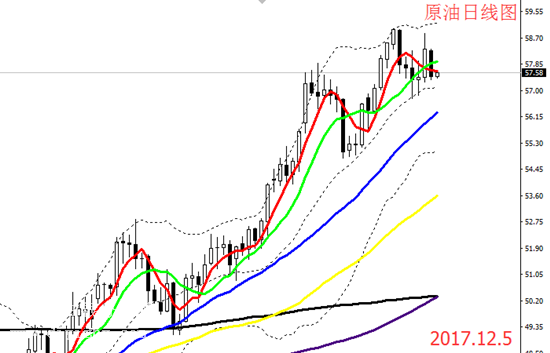 國(guó)際現(xiàn)貨原油周二(12月5日)亞市盤中觸及隔日低位后小幅反彈,最高反彈至57.63美元價(jià)位,上周四OPEC與俄羅斯為首的非OPEC產(chǎn)油國(guó)達(dá)成協(xié)議,共同將減產(chǎn)協(xié)議延長(zhǎng)至2018年年底,油價(jià)趁勢(shì)上沖一波,近期油價(jià)最高觸及59.01美元后回落,幾次上沖均未能刷新新高,原油上方可能會(huì)出現(xiàn)筑頂情況,頁(yè)巖油及其它燃油產(chǎn)商因高油價(jià)而提高產(chǎn)能,將使油價(jià)面臨下行風(fēng)險(xiǎn),而且原油去庫(kù)存化還需待時(shí)日。