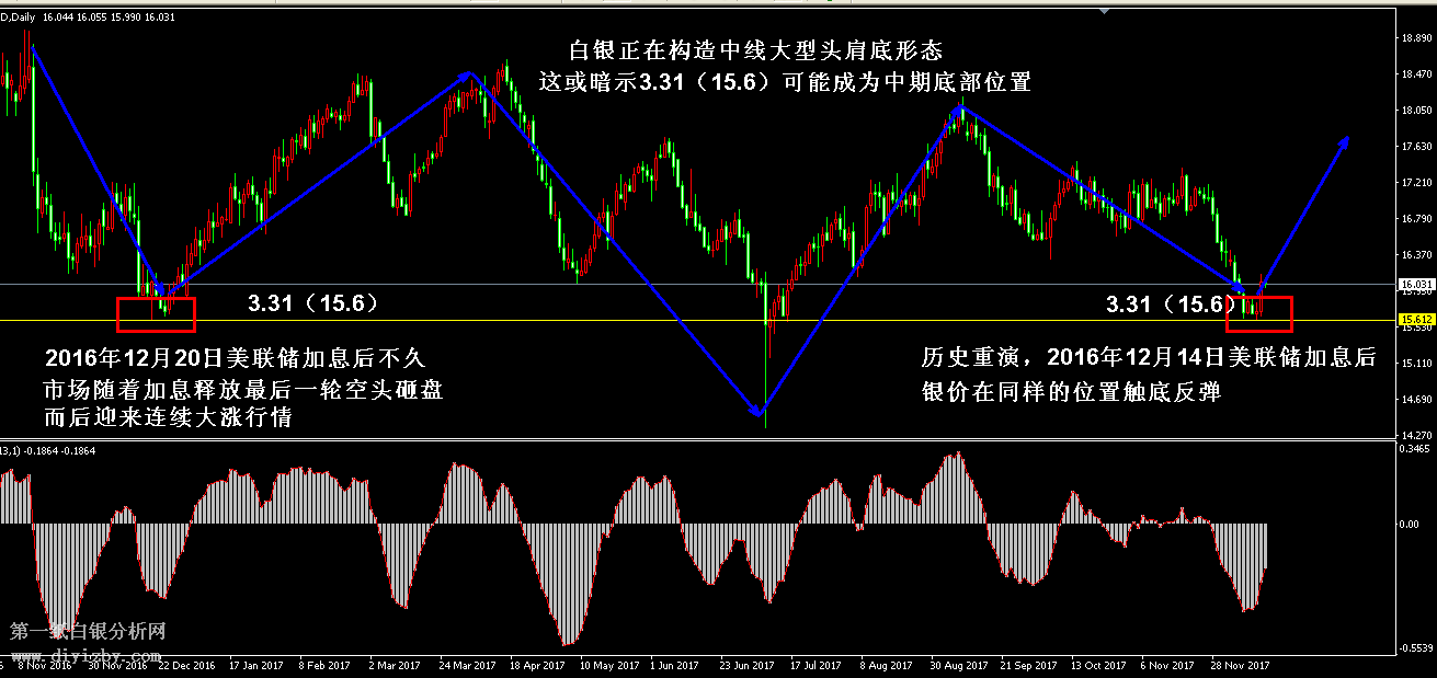 目前紙白銀價格是3.408元/克。昨日白銀價格大幅上漲,雖美聯(lián)儲如期加息,但最終釋放略偏鴿派言論,這令投資者對于2018年加息三次的預(yù)期有所降溫,且前期投資者已經(jīng)提前消化了美聯(lián)儲可能鷹派的預(yù)期,導(dǎo)致市場出現(xiàn)“賣消息,買事實”,在靴子落地后,空頭力量迅速離場,買盤推升幫助銀價大幅上漲。目前技術(shù)形態(tài)雖暫未形成筑底形態(tài),但銀價在支撐位大幅上漲后,動能指標(biāo)迅速收量,投資者需謹(jǐn)防后市行情逐漸止跌企穩(wěn)的可能性。正如我們此前所說,12月往往是銀價出現(xiàn)底部的時間段,過去3年的12月走勢均出現(xiàn)了大跌后觸底反彈的行情,這一次歷史恐再度重演,投資者操作上應(yīng)暫時轉(zhuǎn)為低吸為主高拋為輔的思路,當(dāng)行情二次回踩不破3.31(15.6)后,可確認(rèn)止跌,屆時應(yīng)轉(zhuǎn)向逢低做多為主的思路。如下圖所示為白銀日線走勢圖,2016年12月20日,在美聯(lián)儲加息后不久,銀價走出了最后一次砸盤行情,迅速下探3.31(15.6)后觸底反彈,并完成止跌企穩(wěn),由此形成了圖中左側(cè)紅色框的底部形態(tài),而后在未來4個月內(nèi),走勢一直處于上漲行情之中;這一次歷史重演,2017年12月14日,美聯(lián)儲宣布加息后,銀價便大幅拉升,同樣是借助于3.31(15.6)的支撐位形成反彈,唯一不同的是2016年12月美聯(lián)儲釋放鷹派預(yù)期,而2017年12月美聯(lián)儲釋放略偏鴿派預(yù)期,這也是導(dǎo)致此次行情未出現(xiàn)最后一次砸盤的原因。另外,從橫跨一年的走勢形態(tài)來看,銀價正在構(gòu)造中線大型頭肩底形態(tài),且左肩和頭部已經(jīng)完成,目前右肩完成一半,接下來行情若連續(xù)上行,則走勢將徹底完成中長線頭肩底形態(tài),為2018年的上漲打下堅實的基礎(chǔ)。圖中藍色箭頭所示的左側(cè):2016年12月20日銀價筑底為頭肩底的“左肩”位置;2017年7月銀價砸盤至3.05(14.35)后迅速拉升為頭肩底的“頭部”位置;2017年12月銀價再次回踩與左肩相同點位的3.31(15.6)為頭肩底的“右肩”位置。若走勢如上述頭肩底形態(tài)運行,則接下來行情將走出最右側(cè)藍色箭頭所示的上漲結(jié)構(gòu),以此為頭肩底最后一步畫上完美的句號,同樣驗證歷史的重演,暗示未來幾個月行情將與過去2017年初的走勢一致保持上漲。目前行情出現(xiàn)兩大看漲因素分別是:1.歷史重演,近三年美聯(lián)儲加息后白銀觸底反彈,此次鴿派預(yù)期筑底可能性更大;2.大型頭肩底形態(tài)正在構(gòu)造,行情即將上漲概率較大。基于上述兩大因素,建議投資者短線轉(zhuǎn)向高拋低吸策略,其中靠近3.31(15.6)附近低吸為主,反彈遇強阻力方可高拋,若銀價再次回踩靠近3.31(15.6)不能跌破,則投資者立即扭轉(zhuǎn)思路至逢低做多策略。綜合分析:種種跡象暗示銀價昨日上漲并非偶然,行情正走出近3年12月相同的走勢,同時正構(gòu)造大型底部形態(tài)。目前由于時間較短,銀價還未釋放完全止跌企穩(wěn)的形態(tài),投資者需密切關(guān)注后市行情波動,若再次回踩不能擊穿3.31(15.6),則確認(rèn)銀價底部形成,不排除行情走出與2016年12月同樣的走勢直接V型反轉(zhuǎn)向上拉升。近期操作應(yīng)立即扭轉(zhuǎn)思路為低吸為主,高拋為輔。(注: 由于紙白銀價格是國際銀價換算而來,而換算過程中涉及到人民幣對美元匯率的變化,即使在國際銀價不變化的情況下,如果人民幣貶值或升值,也會導(dǎo)致紙白銀價格出現(xiàn)變動。因此,我們的分析只采用最新的國際銀價對應(yīng)的人民幣白銀價格,如與過去分析價格有出入, 投資者應(yīng)知曉其原因。)