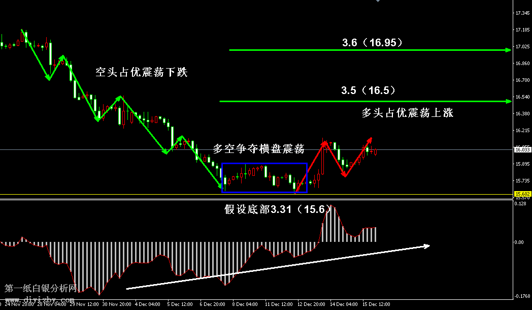 技術僅僅是基于概率論和統計學的一種綜合分析手段,絕非預測。所以技術分析是在考慮做好止損的情況下去博取大概率事件,投資不可過于迷信技術分析。(短線操作請一定做好止損,一旦被損,代表分析師基于概率和統計的技術分析不適用于當前行情) 1、紙白銀短線看點位,中線做方向。 2、以上所有價格為工商銀行買入價,即紙白銀低價。進倉點位要再加點差(各銀行點差不一),出倉則不要。 3、第一紙白銀給出的所有建議僅供投資者參考,不作為下單絕對依據,切勿過于依賴。 4、北京時間08:55發布此文章。 5、上一交易日白銀價格分析情況:(12月15日)白銀多空逐漸轉變 靜待回踩驗證是否反轉