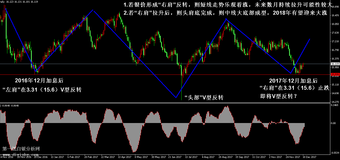 目前紙白銀價格是3.423元/克。昨日白銀價格繼續(xù)上漲,隨著行情向上突破3.43(16.15)的上周高點,銀價近期再度創(chuàng)出新高,這驗證了短線行情已開啟震蕩上行模式,同時確認了底部3.31(15.6)的反轉(zhuǎn)事實,一方面短線趨勢進入上漲,另一方面中長線走勢也將開啟拉升,這暗示未來幾個月銀價走勢將持續(xù)樂觀的可能性極大,目前價格正距離底部不遠,建議投資者應(yīng)主要采取逢低做多思路為主。如下圖所示為白銀日線走勢圖,由于目前銀價筑底反轉(zhuǎn)可能性較大,且未來行情短線及中長線恐將開啟上漲,當(dāng)下我們?nèi)砸灾衅谮厔莘治觯詭椭顿Y者更好的把握一輪波段及中線趨勢的到來。圖中藍線所示為2016年12月至2017年12月走勢形態(tài),中線走勢跨度一年后終于有望形成“頭肩底”大底部,這為中長線牛市行情奠定了基礎(chǔ)。2016年12月美聯(lián)儲加息后,銀價在3.31(15.6)止跌企穩(wěn),而后行情迎來了連續(xù)性上漲,走勢圍繞3.31(15.6)發(fā)生V型反轉(zhuǎn),恰恰是此時,行情悄悄奠定了“左肩”形態(tài);2017年7月銀價出現(xiàn)短期內(nèi)的快速砸盤,瞬間觸及3.05(14.35)的支撐位,而后迅速拉升,亦形成V型反轉(zhuǎn),依靠此V型反轉(zhuǎn),行情奠定了“頭部”形態(tài);2017年12月歷史再度重演,與2016年12月一致,隨著美聯(lián)儲加息消息落地,銀價圍繞3.31(15.6)的相同位置發(fā)生止跌企穩(wěn),而隨著昨日行情向上突破3.43(16.15),超短線走勢已經(jīng)形成了震蕩上漲的格局,這暗示日線走勢奠定了3.31(15.6)的底部,后市行情有較大概率圍繞該支撐形成反轉(zhuǎn),并不排除行情再次發(fā)生V型反轉(zhuǎn)的可能性。目前的底部確立后,震蕩上漲形態(tài)將成為事實,則頭肩底的“右肩”形態(tài)將逐漸形成,這暗示未來幾個月銀價的反彈將以構(gòu)造“右肩”為主,短線走勢在未來數(shù)月表現(xiàn)樂觀。另一方面,此次上漲與2016年12月還有一個明顯的區(qū)別,那就是2016年的上漲僅僅是左肩形態(tài)構(gòu)造,并無中線底部特征支持;而2017年12月所形成的上漲是右肩形態(tài)構(gòu)造,一旦構(gòu)造完畢后,將形成中線“頭肩底”,該中線頭肩底是中長線行情正式開啟上升的信號,也是行情剛剛要拉升的特征。換言之,此輪短線銀價上漲完畢后,緊接著是一輪中長線行情的上漲,短線行情若如過去2016年持續(xù)3~4個月,則中線行情在頭肩底形成后或?qū)⒊掷m(xù)更長時間,這暗示2018年的走勢將非常樂觀。在2018年第一個季度,銀價有望圍繞“右肩”形態(tài)上行,后面幾個季度,則銀價有望依靠中線“頭肩底”上行,顯然,當(dāng)下是投資者布局短線、波段、中線、長線最佳進場時機。綜合分析:近期行情多空力量轉(zhuǎn)變特征非常明顯,結(jié)合歷史和主趨勢形態(tài),我們認為一輪波段上漲即將開啟,等待波段上漲結(jié)束后,中長線底部又將形成,顯然上升空間是較大的。當(dāng)下投資者應(yīng)重點以逢低做多思路為主,由于當(dāng)前價格距離底部較近,投資者可采取分批布局多單的方式加倉,止損可放大至中線支撐位3.25(15.3)下方較為穩(wěn)健,只要銀價不跌破該點位,則“右肩”形態(tài)將仍然在構(gòu)造中。(注: 由于紙白銀價格是國際銀價換算而來,而換算過程中涉及到人民幣對美元匯率的變化,即使在國際銀價不變化的情況下,如果人民幣貶值或升值,也會導(dǎo)致紙白銀價格出現(xiàn)變動。因此,我們的分析只采用最新的國際銀價對應(yīng)的人民幣白銀價格,如與過去分析價格有出入, 投資者應(yīng)知曉其原因。)