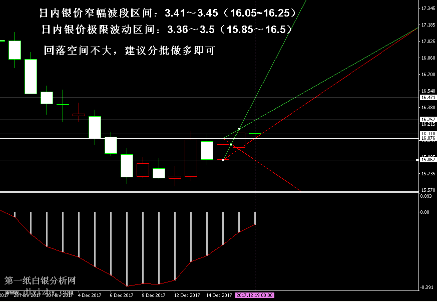 技術(shù)僅僅是基于概率論和統(tǒng)計學(xué)的一種綜合分析手段,絕非預(yù)測。所以技術(shù)分析是在考慮做好止損的情況下去博取大概率事件,投資不可過于迷信技術(shù)分析。(短線操作請一定做好止損,一旦被損,代表分析師基于概率和統(tǒng)計的技術(shù)分析不適用于當(dāng)前行情) 1、紙白銀短線看點位,中線做方向。 2、以上所有價格為工商銀行買入價,即紙白銀低價。進倉點位要再加點差(各銀行點差不一),出倉則不要。 3、第一紙白銀給出的所有建議僅供投資者參考,不作為下單絕對依據(jù),切勿過于依賴。 4、北京時間08:55發(fā)布此文章。 5、上一交易日白銀價格分析情況:(12月18日)白銀圍繞底部緩慢拉升 趨勢反轉(zhuǎn)概率極大