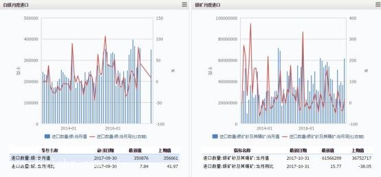 白銀月度進口數(shù)據(jù)來看,截止到2017年9月30 日,我國白銀進口量為35.09噸,進口數(shù)量同月比增長7.84%,上期(20173月31 日)值為35.67噸。銀礦月度進口量截止2017年10月31日6156.63噸,同月相比增長15.77%,上期(2017年9月30 日)值為3675.27噸。